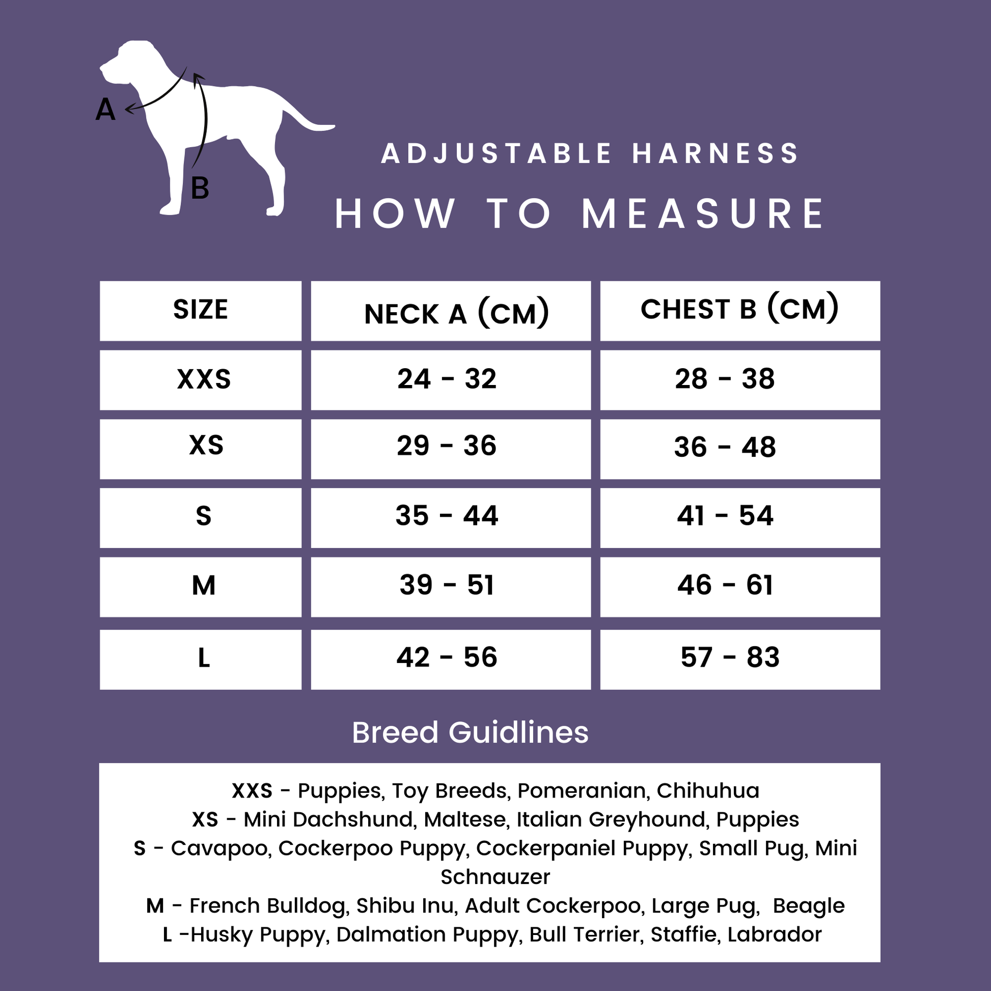 El arnés perfecto para perros pequeños y grandes, desde pomeranias y teckels hasta bulldogs franceses y staffordshire bulldogs.