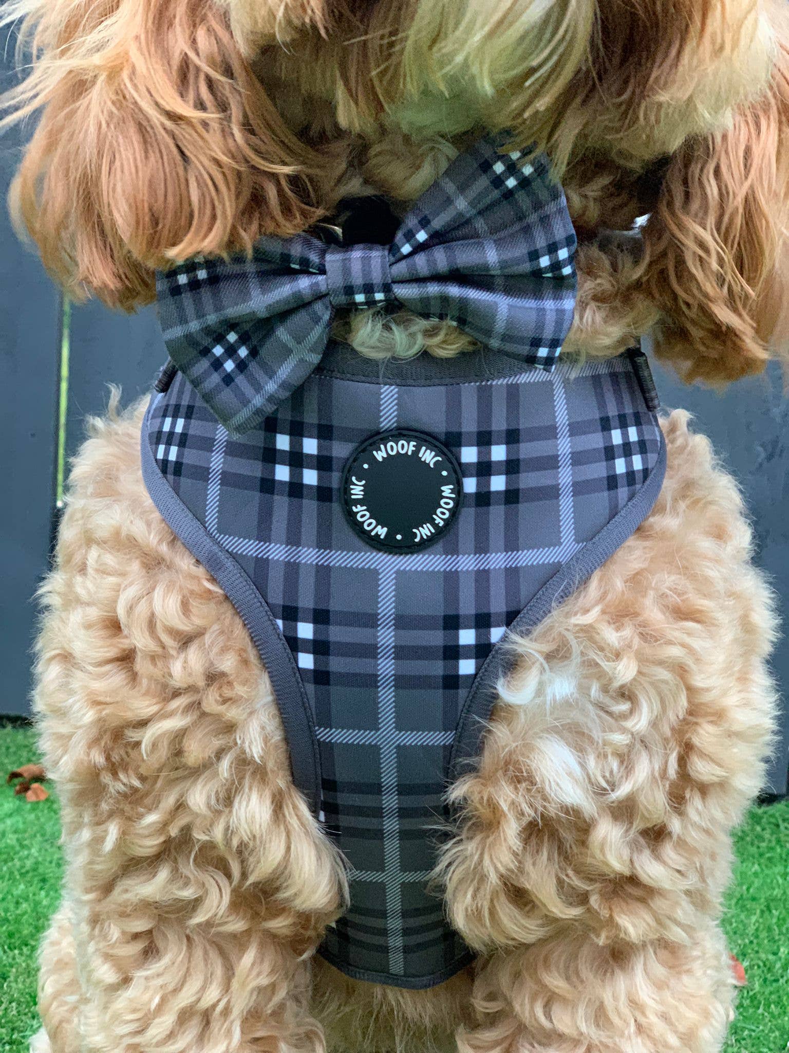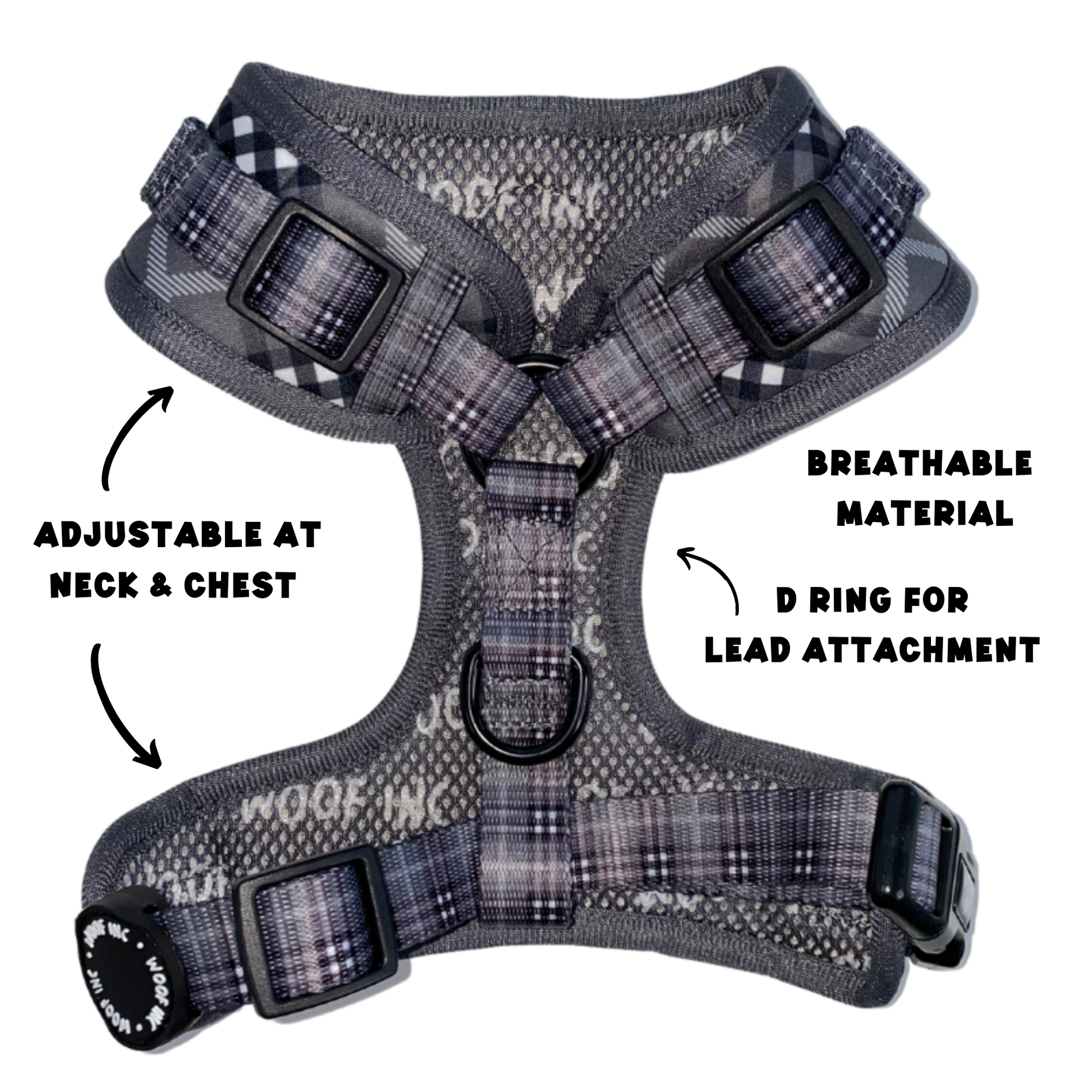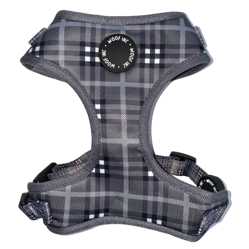 Arnés ajustable para perros con cuadros escoceses negros y grises