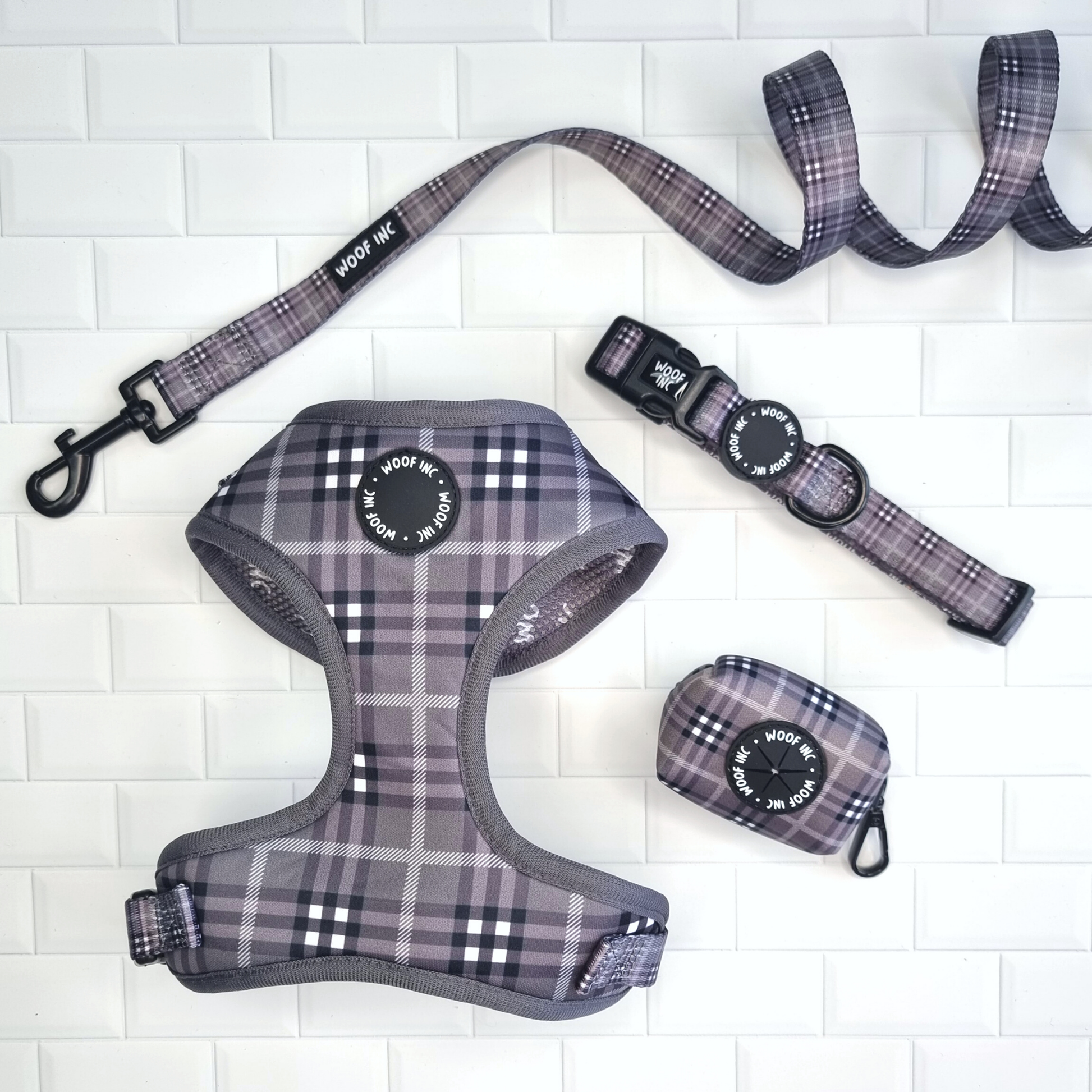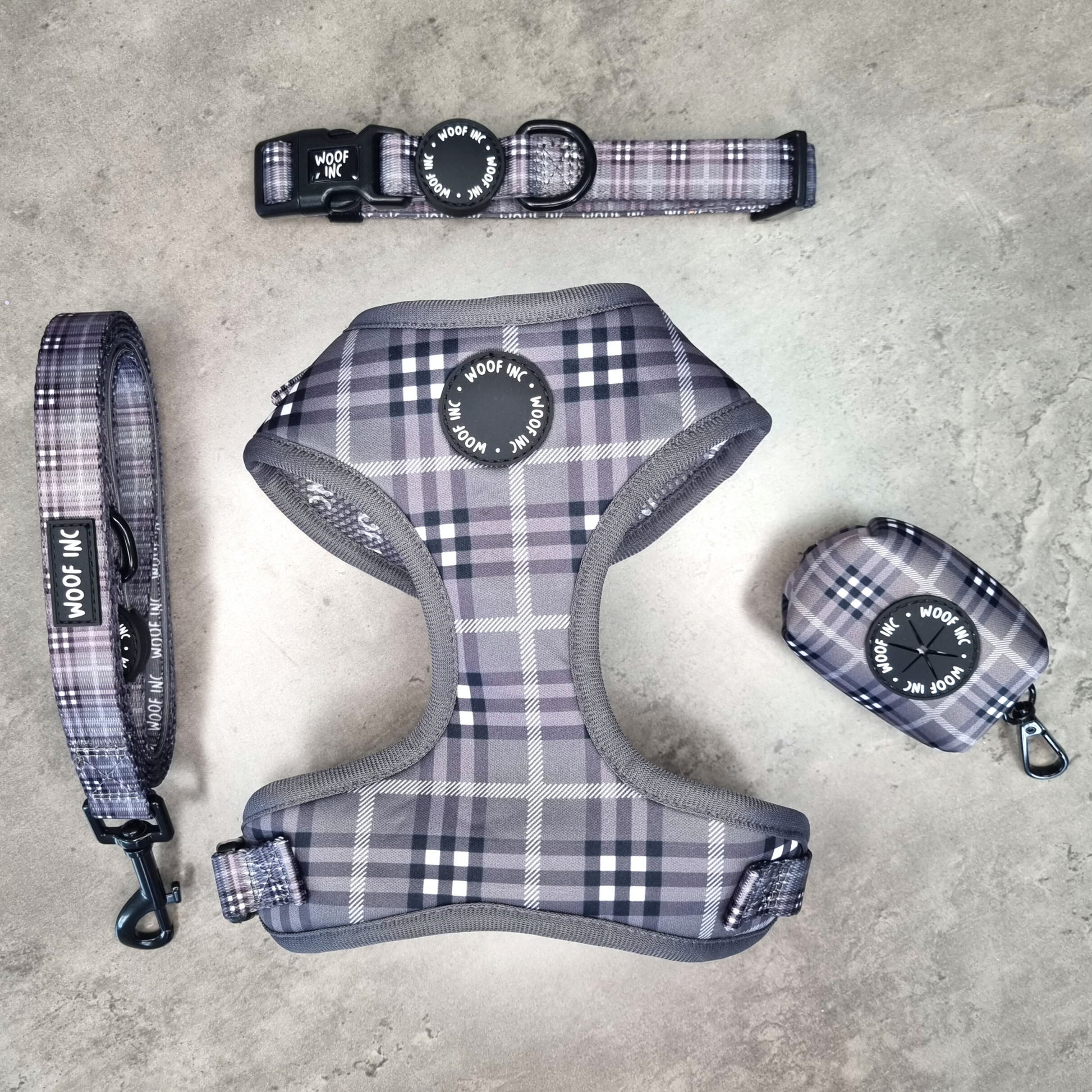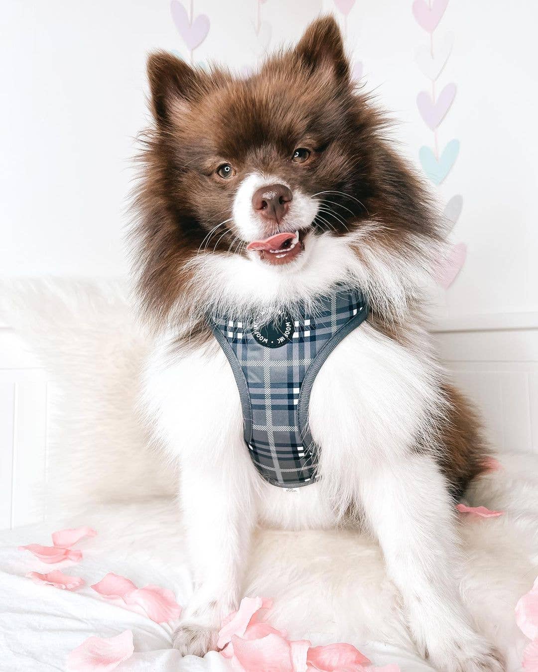 Arnés ajustable para perros con cuadros escoceses negros y grises