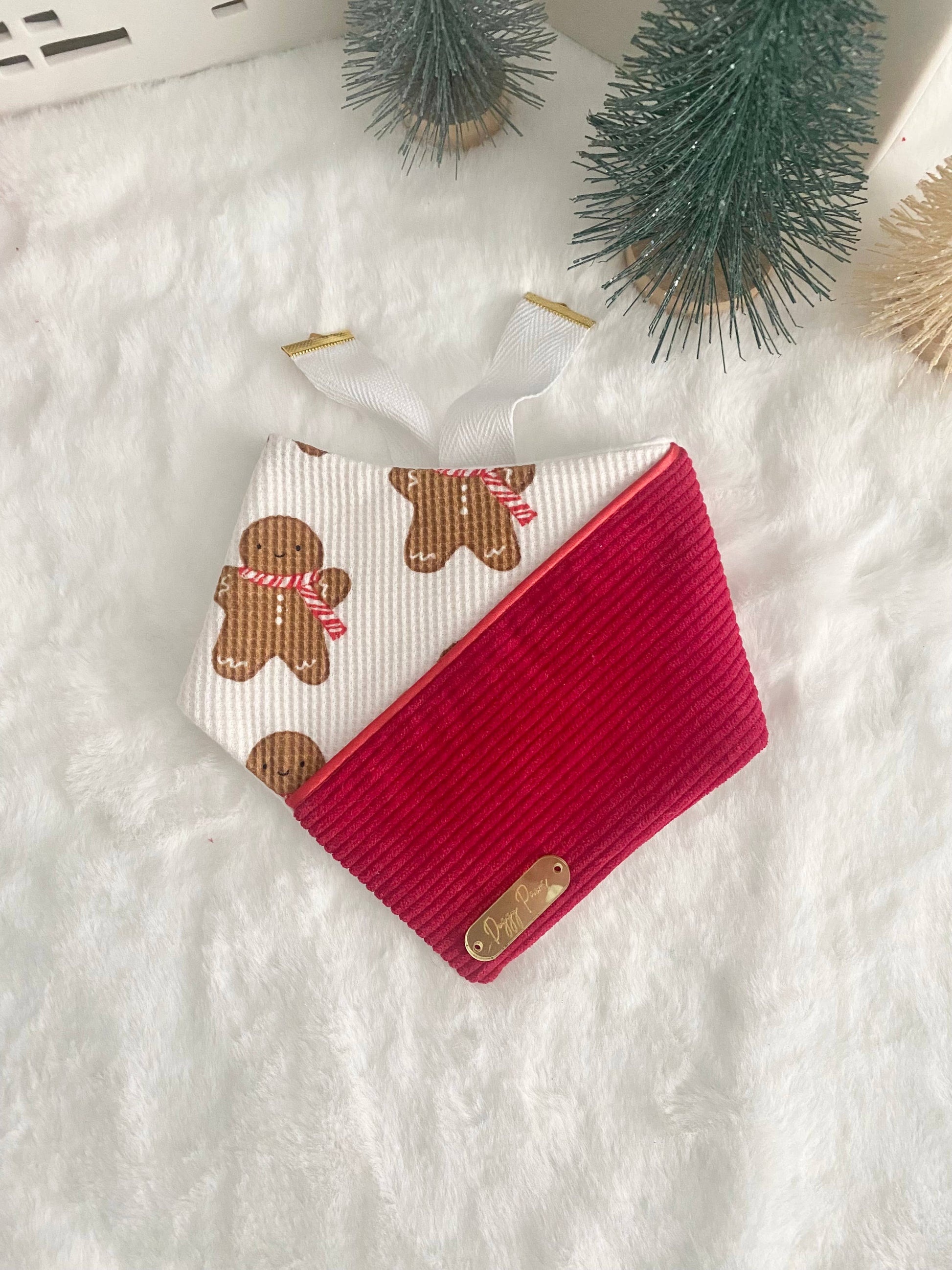 Este pañuelo está hecho con una tela de pana roja con punto gofre de pan de jengibre y ribetes rojos. Cada pañuelo viene con una etiqueta de logotipo de acrílico dorado cosida a mano. Viene con un lazo tejido alrededor del cuello con broches de metal dorado en cada extremo. Tallas: Las tallas también se indican en la foto. Tallas de la circunferencia del pañuelo en pulgadas: XS hasta 11” de cuello, aprox. menos de 15 libras S hasta 16” de cuello, aprox. 20-45 libras M hasta 22” de cuello, aprox. 50-75 libras L hasta 26” de cuello, aprox. 80+ libras Si el perro está entre dos tallas o es muy esponjoso, elige una talla más grande. Cuidados: Limpiar solo las manchas. Colóquelo en posición horizontal para secar. Planche a temperatura baja. Advertencia: Su mascota nunca debe dejarse desatendida con un pañuelo o accesorio.