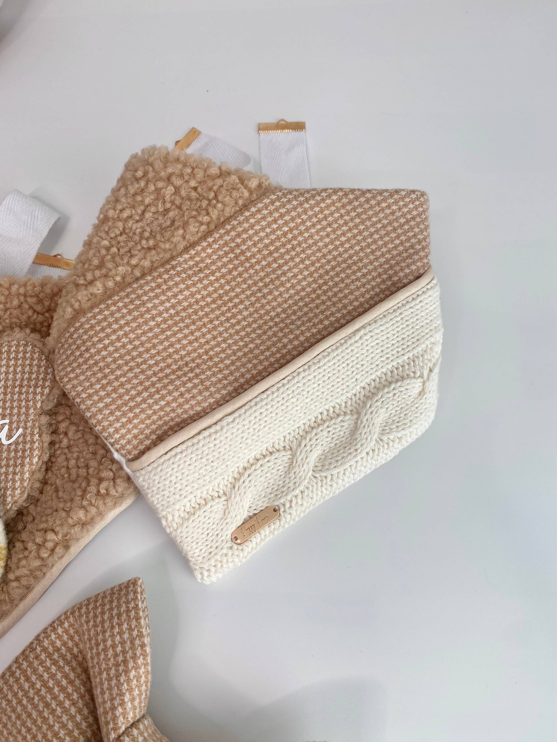 Dog Bandana: This bandana is made with a cream sweater knit, houndstooth jacquard, and teddy sherpa fabric with piping detail along the front. Each bandana comes with a gold logo tag hand sewn on. Comes with a woven tie around the neck with gold metal clasps on each end. Handmade in Seattle, WA Sizing: Sizing outlined in photo as well. Sizing of bandana circumference in inches: XS up to 11” neck, approx. under 15lbs S up to 16” neck, approx. 20-45lbs M up to 22” neck, approx. 50-75lbs L up to 26” neck, approx. 80+lbs If dog is in between sizes or extra fluffy, size up Care: Spot clean only. Lay flat to dry. Iron low heat. Warning: Your pet should never be left unattended wearing a bandana or accessory.