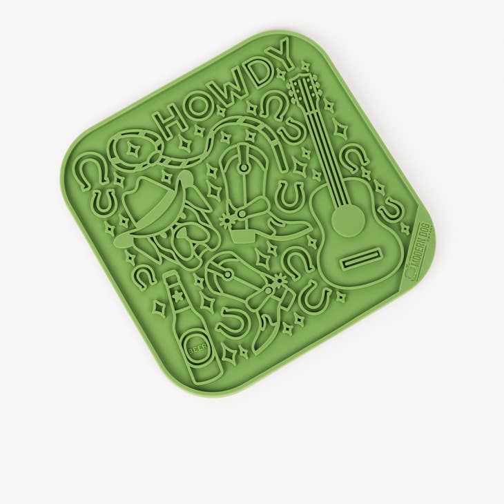 Esta alfombrilla para lamer Howdy fue diseñada como una oda a Nashville y a todos los amantes de la guitarra, la cerveza y la música country. - Combate el aburrimiento - Alivia y calma - Promueve la estimulación mental - Promueve la salud dental - Ventosas - 100% silicona de grado alimenticio Incluye: 1 alfombrilla para lamer, 1 espátula y 1 cepillo para fregar
