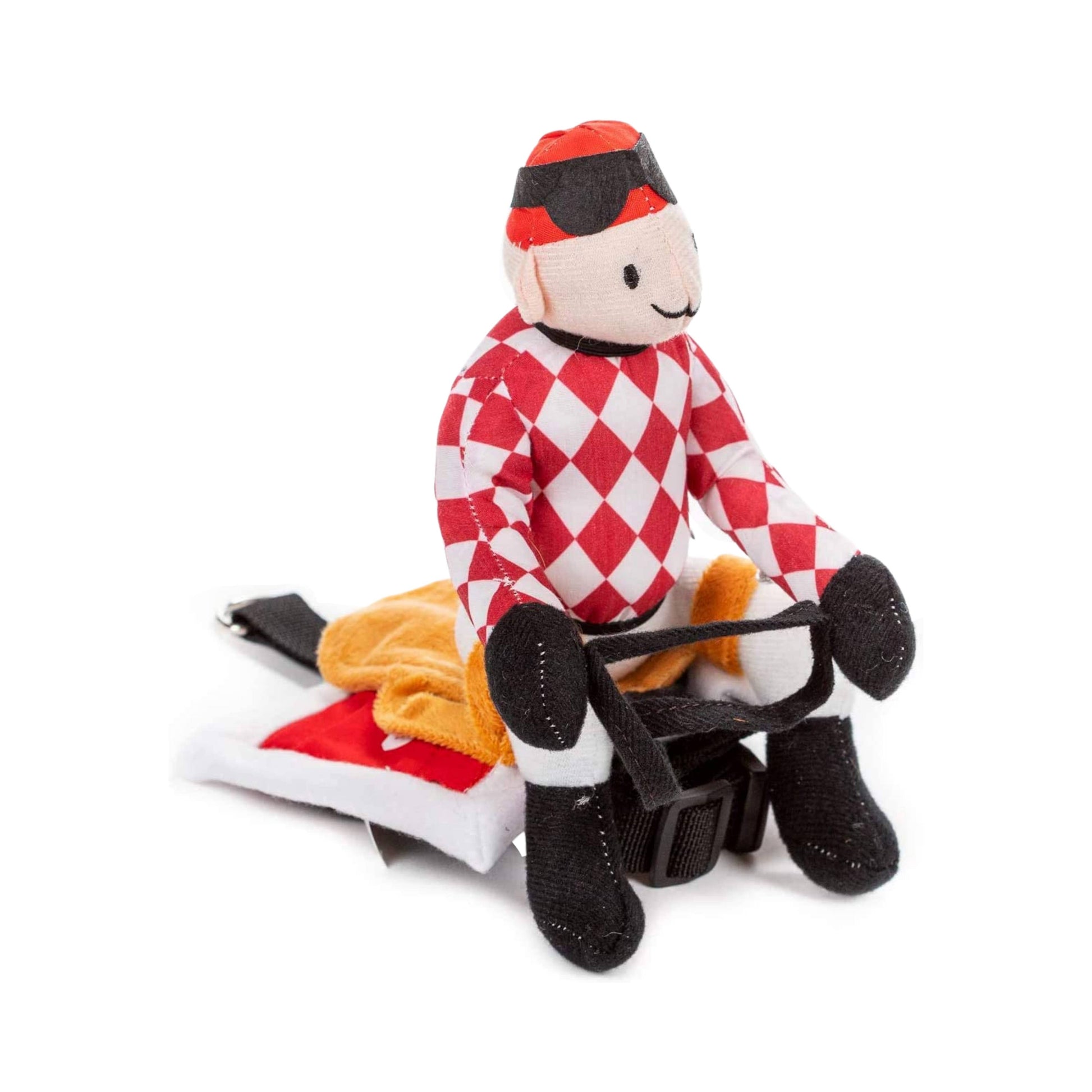 ¡Arriba! Este divertido disfraz se puede usar para Halloween o para la carrera de caballos Kentucky Derby. Incluye un jinete con traje rojo y blanco que se puede acoplar con una silla de montar para que parezca que está montando a tu perro. El jinete y la silla de montar son livianos, por lo que tu perro no se sentirá incómodo al usarlos. El disfraz se abrocha con hebillas y el anillo en D permite colocar una correa, por lo que el disfraz también funciona como arnés. Grande: 16" de largo de espalda, 20" de pecho, 14" de cuello.