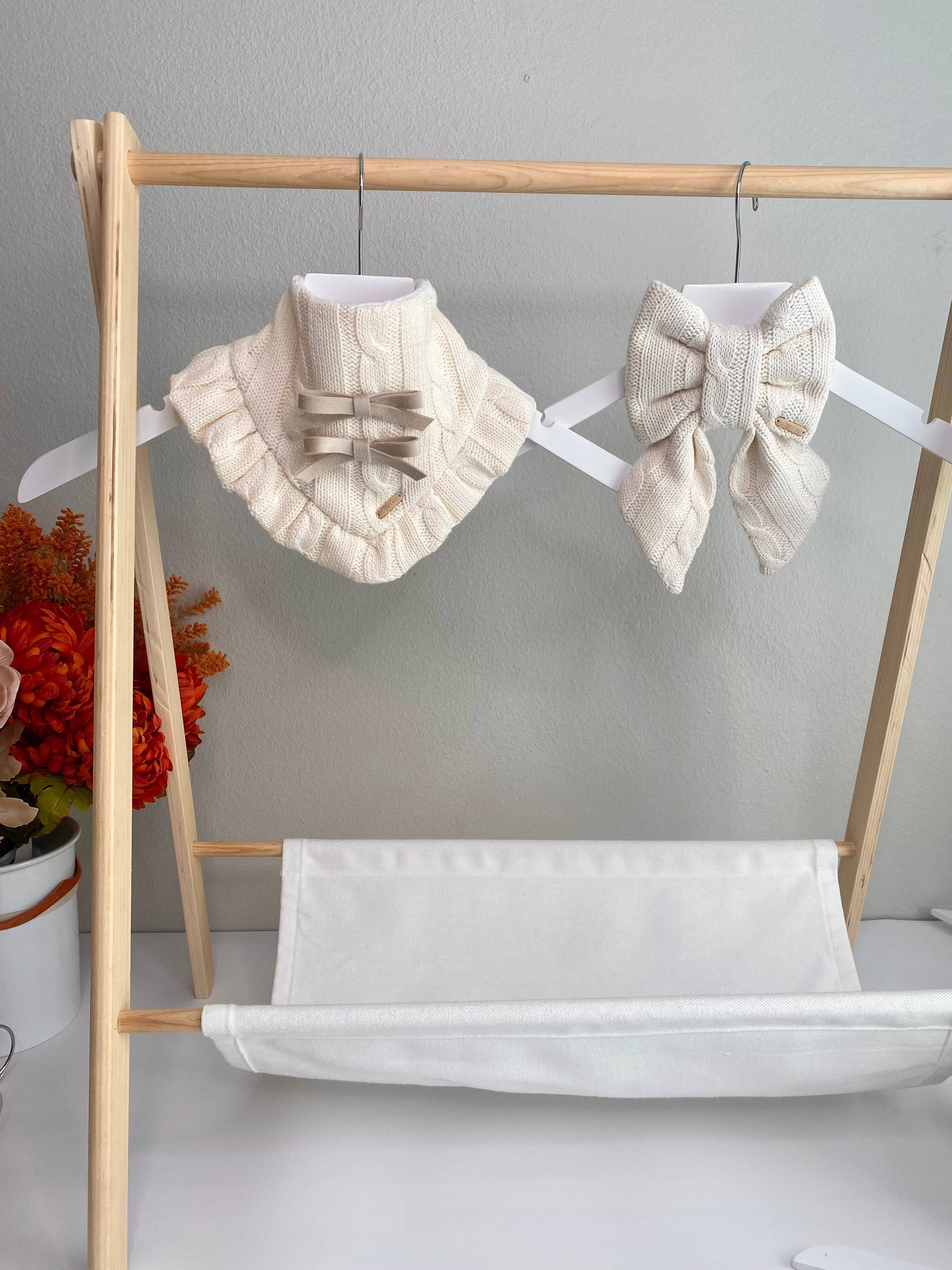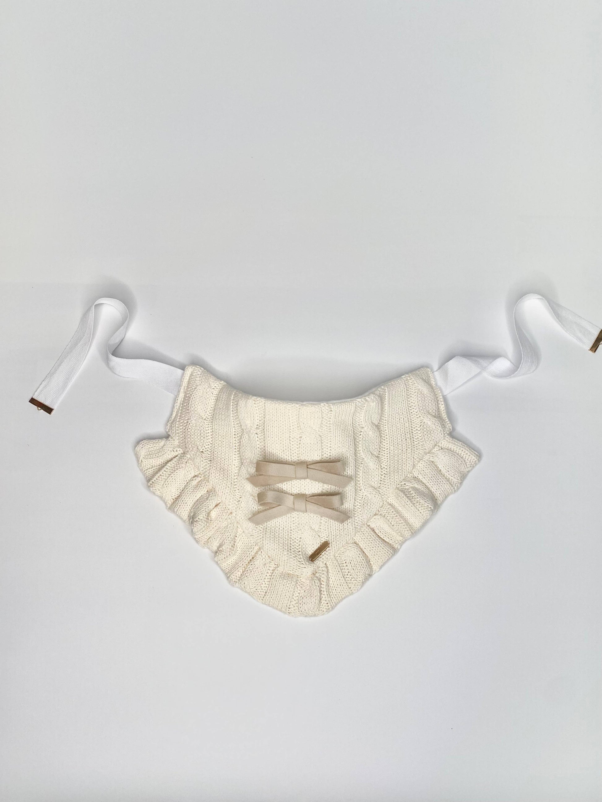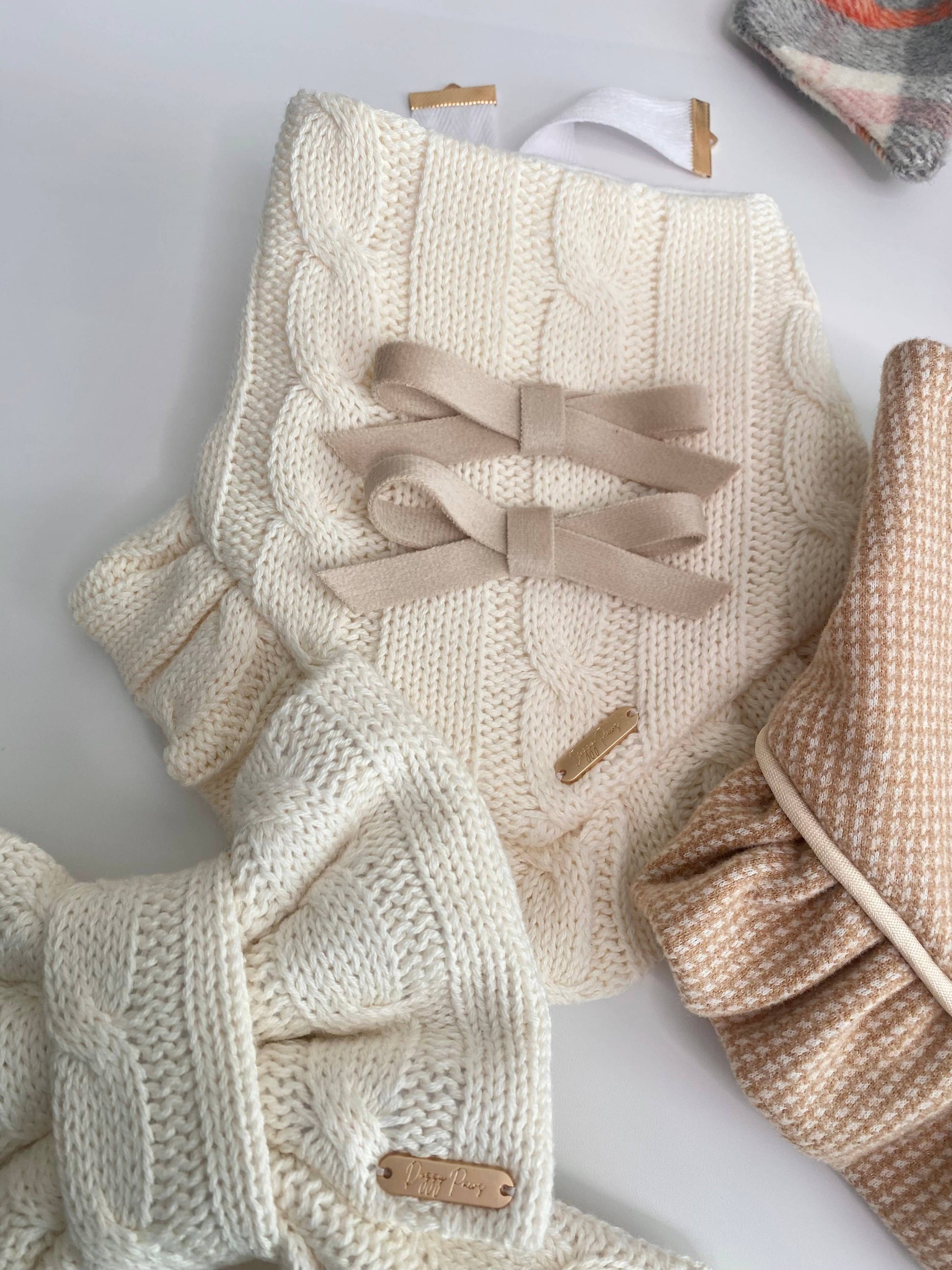 Dog Bandana: This bandana is made with a cream sweater knit fabric with velvet bows on the front. Ruffle adds 1” to length of bandana. Each bandana comes with a gold logo tag hand sewn on. Comes with a woven tie around the neck with gold metal clasps on each end. Handmade in Seattle, WA Sizing: Sizing outlined in photo as well. Sizing of bandana circumference in inches: XS up to 11” neck, approx. under 15lbs S up to 16” neck, approx. 20-45lbs M up to 22” neck, approx. 50-75lbs L up to 26” neck, approx. 80+lbs If dog is in between sizes or extra fluffy, size up Care: Spot clean only. Lay flat to dry. Iron low heat. Warning: Your pet should never be left unattended wearing a bandana or accessory.