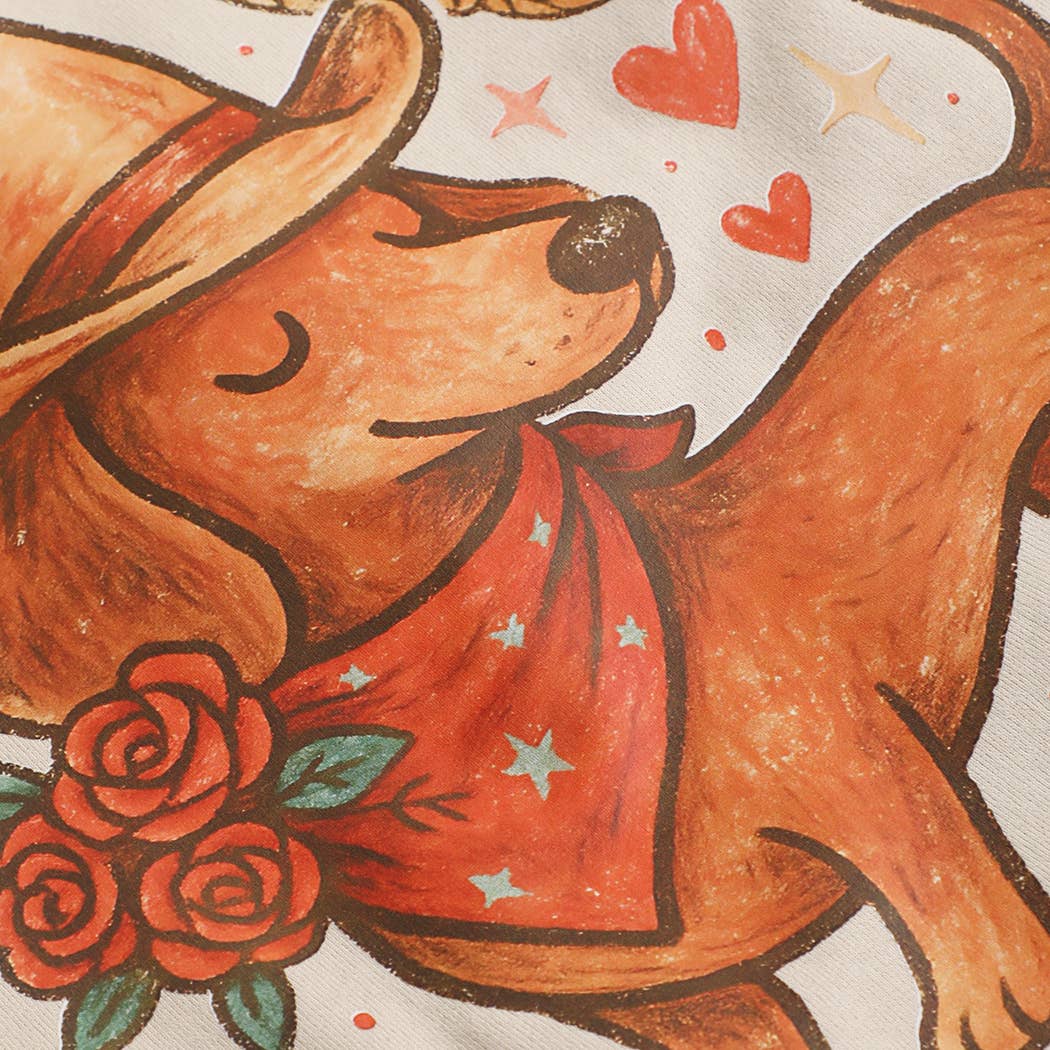 A cute Western dachshund dressed in a cowboy hat, boots, and bandana, surrounded by hearts, stars, and roses. A playful, charming design perfect for dog lovers and western-style fans. Stay comfortable and stylish with our Heavyweight Classic Fit Crewneck Sweatshirt. Featuring a relaxed unisex fit, it’s perfect for layering and everyday wear. Made from a durable cotton/polyester blend, this sweatshirt offers warmth, comfort, and long-lasting quality. Professionally customized in the USA with DTF printed graphics, it delivers vibrant colors and a lasting design. A versatile fashion essential, it pairs effortlessly with jeans, joggers, or casual outfits. Available in color Sand in unisex sizes S–XL.