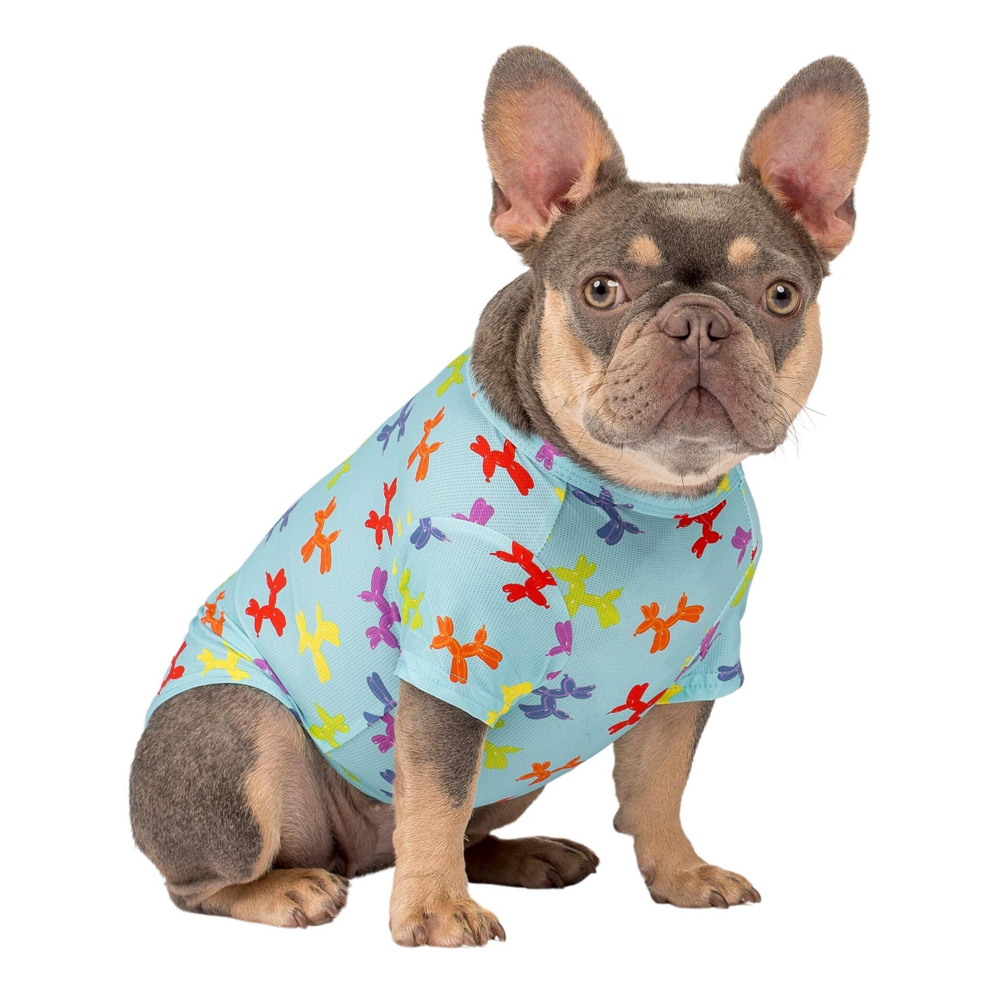 The dog shirts are made of 95% cotton and 5% spandex. This allows the fabric to have stretch and to fit a wide range of breeds. This dog shirt is designed to keep your pup cool this summer. This shirt is designed to hold water, and has a breathable mesh skin that helps to conduce evaporation. How to use this cooling shirt. 1) Before placing this shirt on your dog, place the shirt under water. 2) Wring the shirt out lightly and place on your dog. 3) The shirt will now start to help cool your dog down. Wet as required.