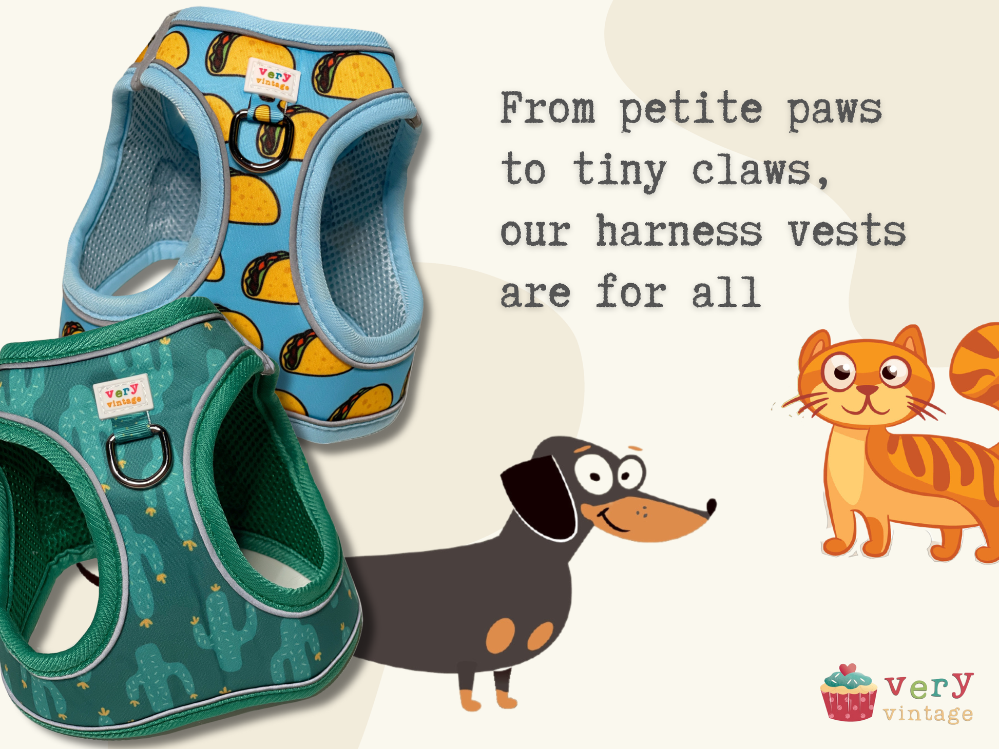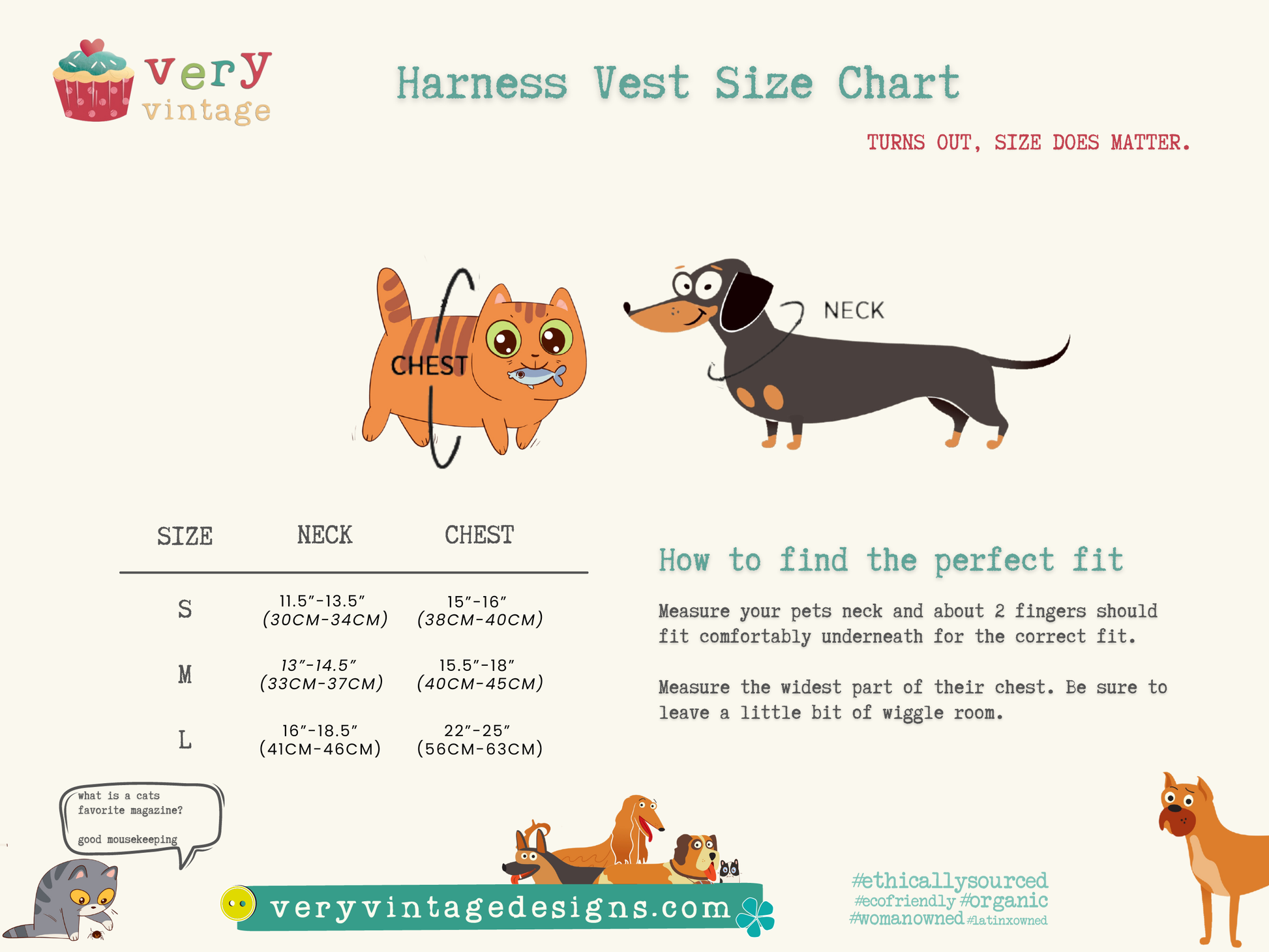 Made specifically with small dogs and kitties in mind! Soft & Comfy Padded Bodice Breathable Mesh Inner Lining All Eco-friendly and Earth-friendly materials made of recycled plastics Heavy Duty and Lightweight colored plastic buckles and adjustment sliders Solid Metal front and back d-rings for leash attachment options Reflective pieces on the front Sizing Guide: in photos