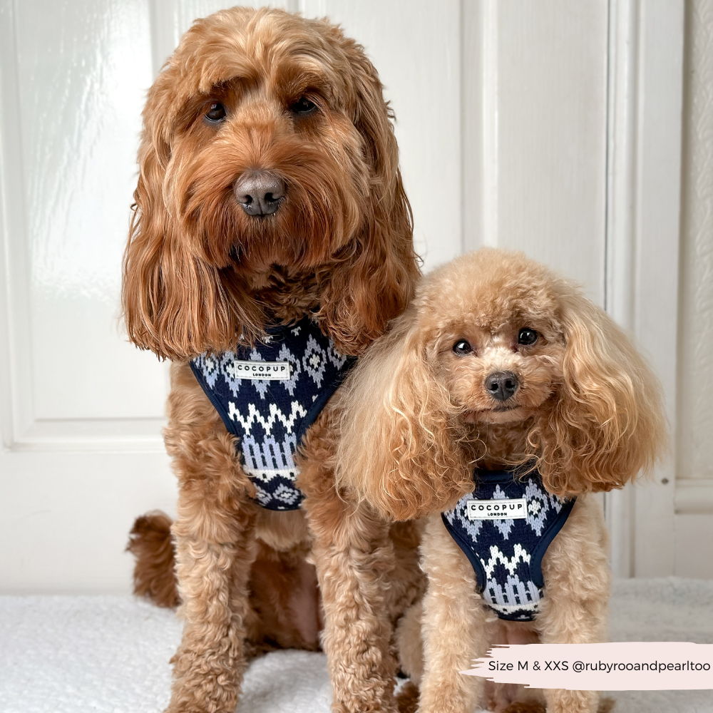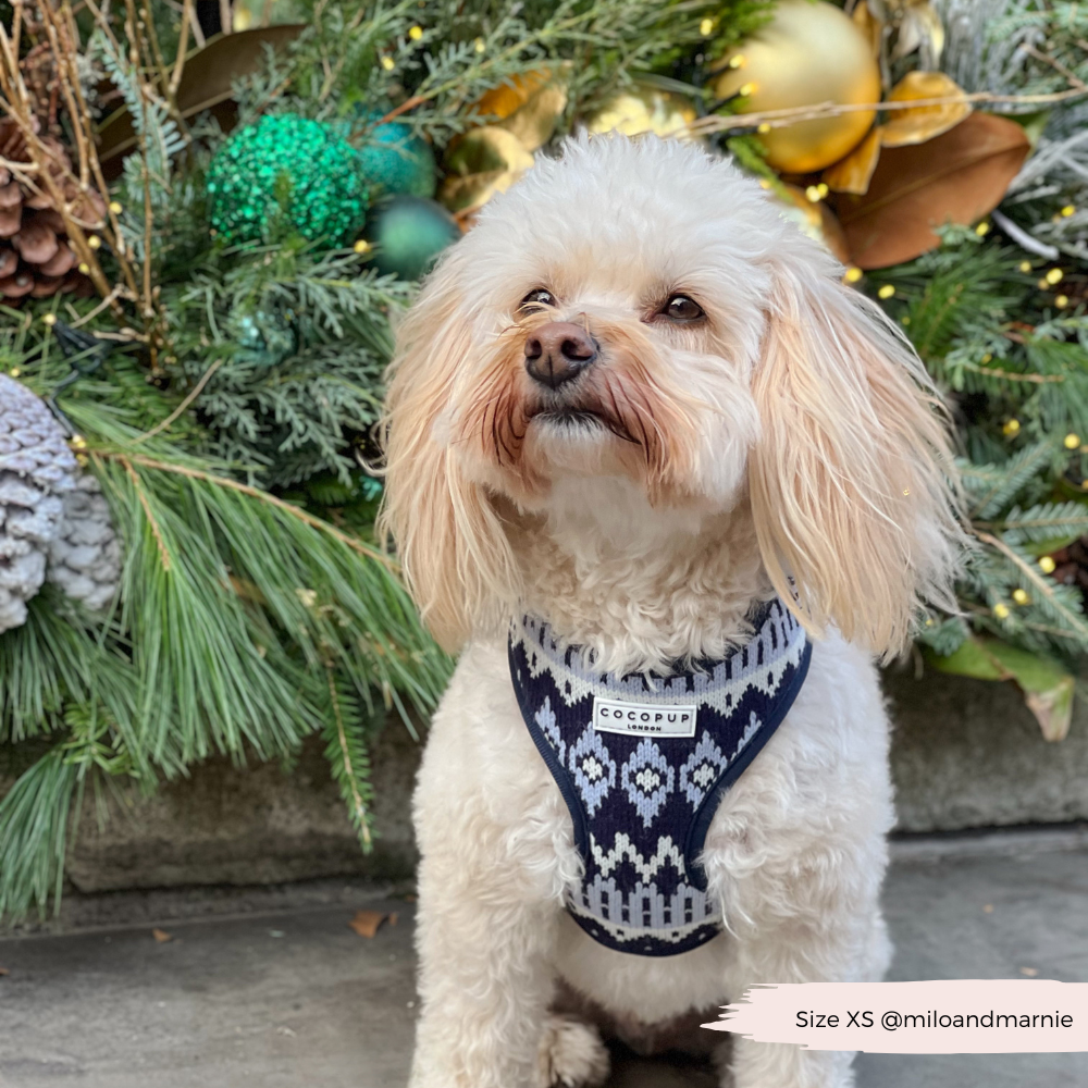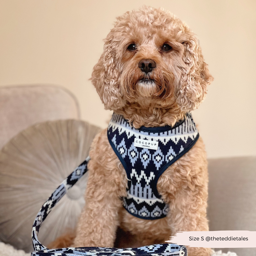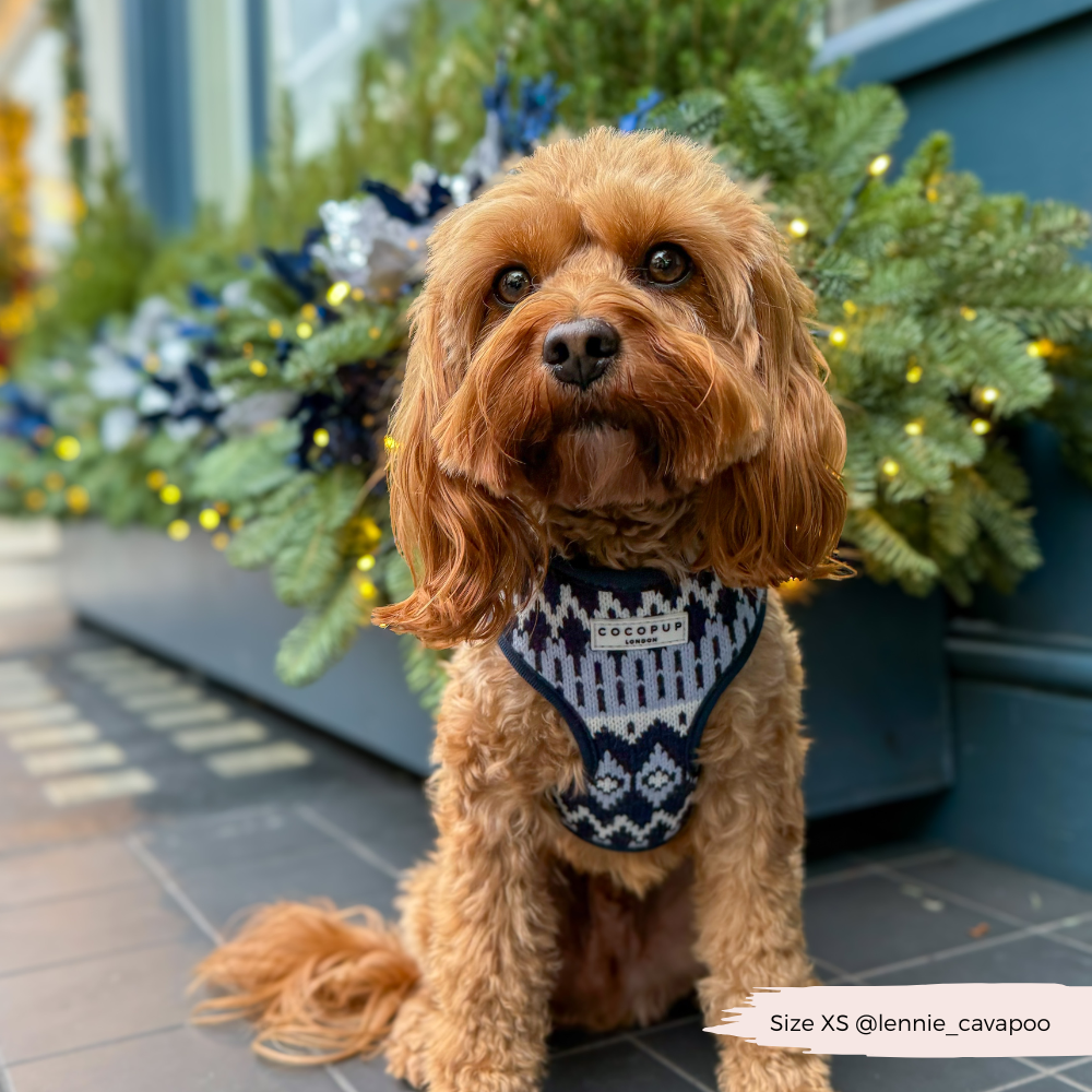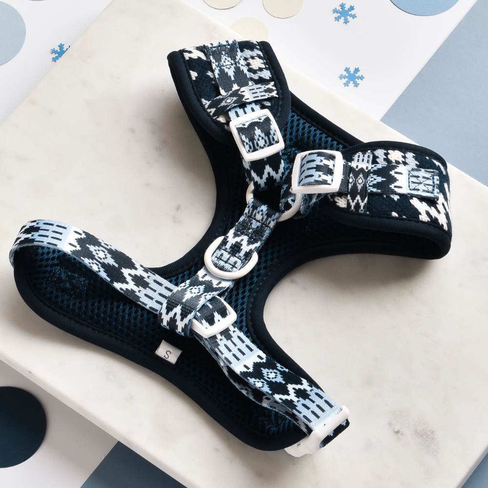 Take your furry friend on the ultimate winter stroll with the Chalet Pup Adjustable Neck Harness. This knitted style blue harness features a charming fair isle design, perfect for keeping your pup stylish and cosy on your dog walks. Enjoy the season with your pup in style! Our Adjustable Neck harnesses provide a comfy and stylish alternative to collars. Slide over your pup's head, adjust at the neck and chest, fasten at the side and you'll be "walkies" ready! * Black D ring for lead attachment * Polyester Material - quick drying! * Lightweight and comfortable
