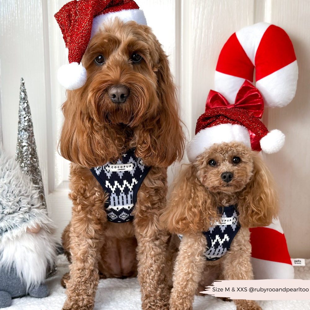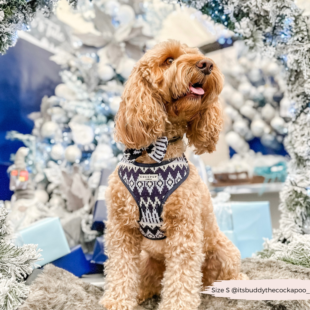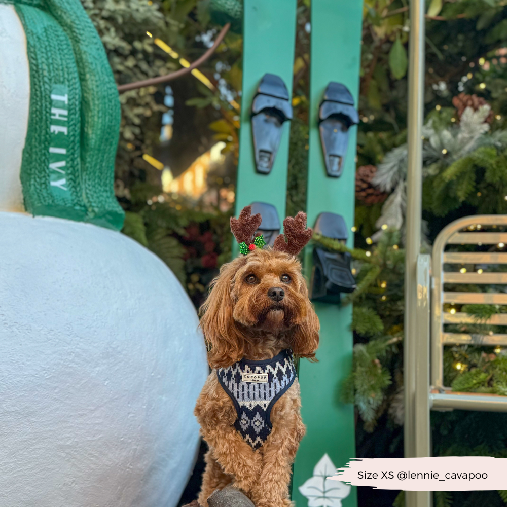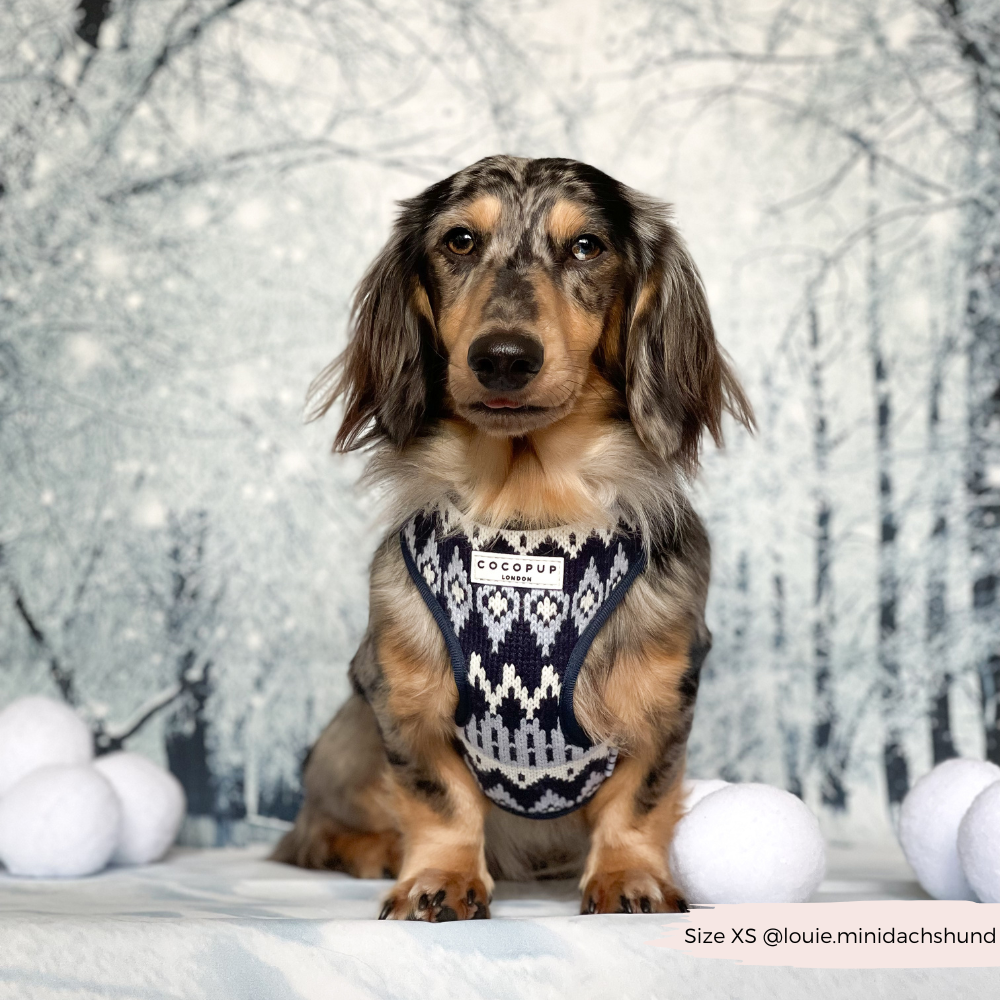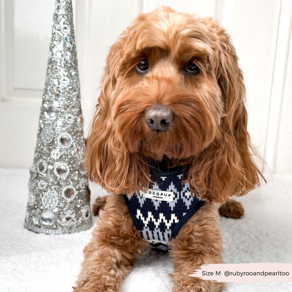 Take your furry friend on the ultimate winter stroll with the Chalet Pup Adjustable Neck Harness. This knitted style blue harness features a charming fair isle design, perfect for keeping your pup stylish and cosy on your dog walks. Enjoy the season with your pup in style! Our Adjustable Neck harnesses provide a comfy and stylish alternative to collars. Slide over your pup's head, adjust at the neck and chest, fasten at the side and you'll be "walkies" ready! * Black D ring for lead attachment * Polyester Material - quick drying! * Lightweight and comfortable