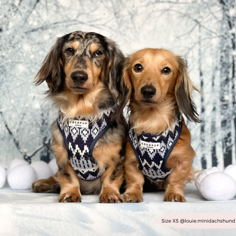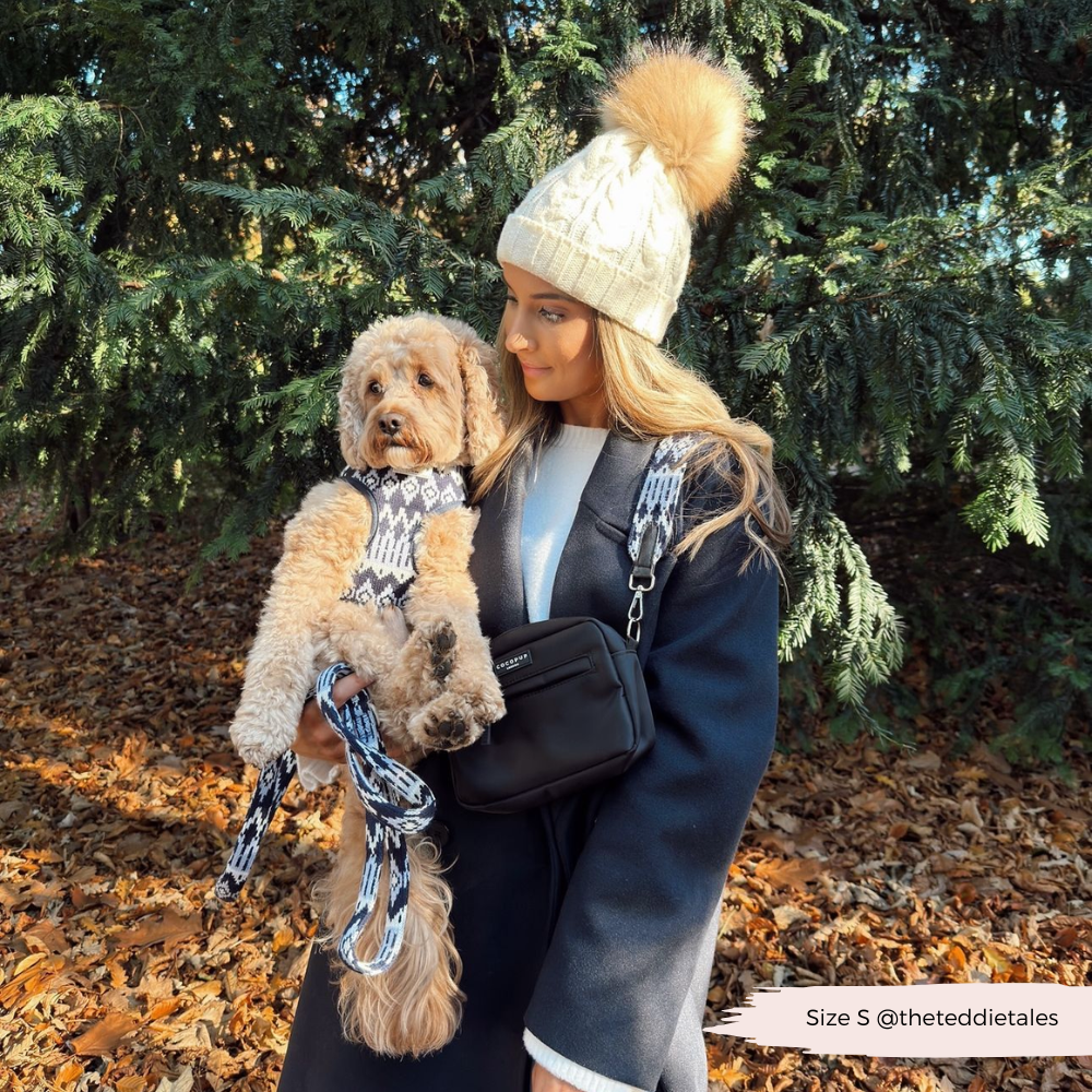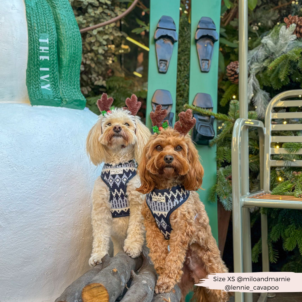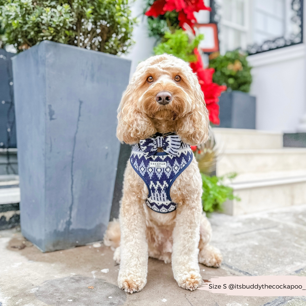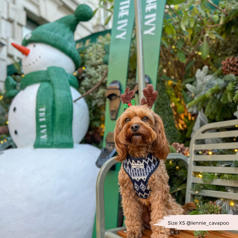 Take your furry friend on the ultimate winter stroll with the Chalet Pup Adjustable Neck Harness. This knitted style blue harness features a charming fair isle design, perfect for keeping your pup stylish and cosy on your dog walks. Enjoy the season with your pup in style! Our Adjustable Neck harnesses provide a comfy and stylish alternative to collars. Slide over your pup's head, adjust at the neck and chest, fasten at the side and you'll be "walkies" ready! * Black D ring for lead attachment * Polyester Material - quick drying! * Lightweight and comfortable