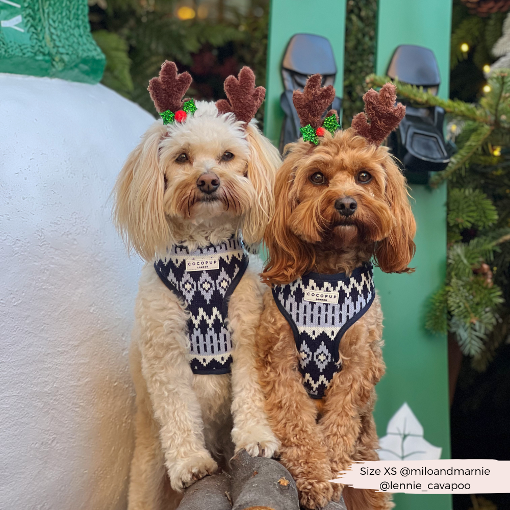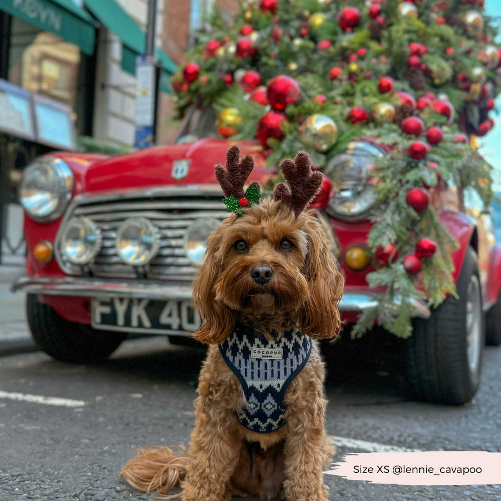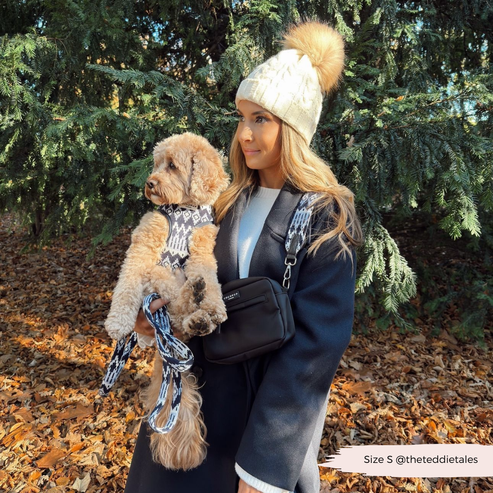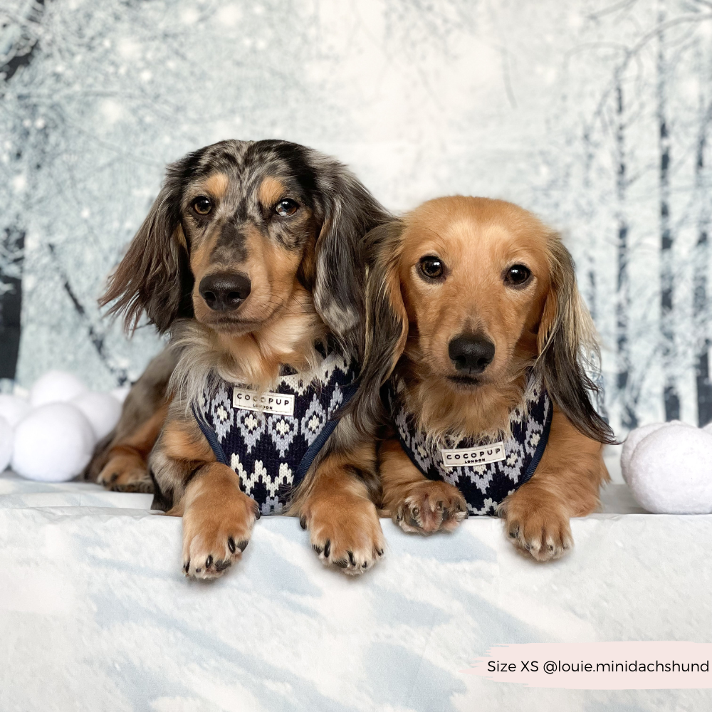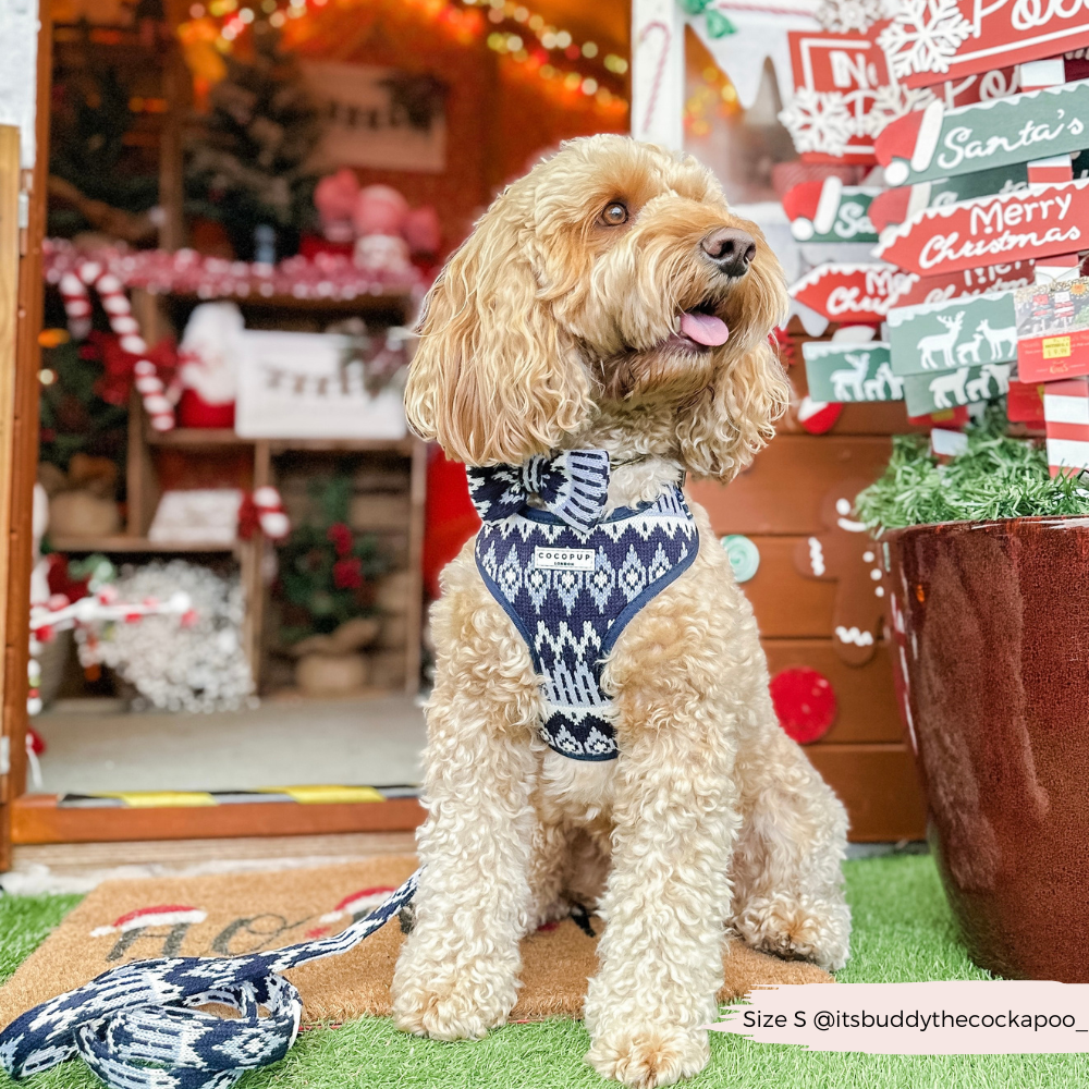 Take your furry friend on the ultimate winter stroll with the Chalet Pup Adjustable Neck Harness. This knitted style blue harness features a charming fair isle design, perfect for keeping your pup stylish and cosy on your dog walks. Enjoy the season with your pup in style! Our Adjustable Neck harnesses provide a comfy and stylish alternative to collars. Slide over your pup's head, adjust at the neck and chest, fasten at the side and you'll be "walkies" ready! * Black D ring for lead attachment * Polyester Material - quick drying! * Lightweight and comfortable