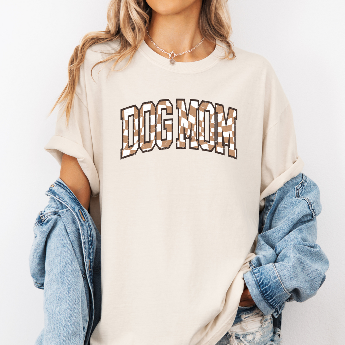 Show off your favorite title with this quirky Checkered Dog Mom T-Shirt. The distressed checkered design adds a touch of playfulness to your dog-loving style. Wear it proudly as a reminder of the special bond between you and your furry friend. Because let's face it, being a dog mom is the best title ever! Color: Ivory