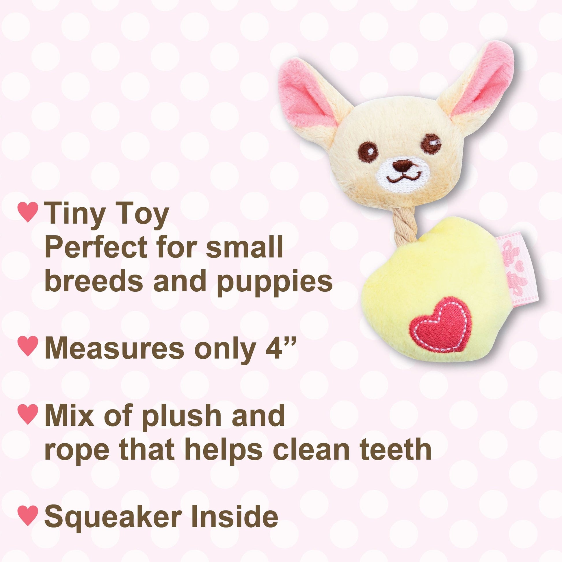 The CHI-WEAR Collection has been designed for the needs of your Chihuahua. Tiny enough for your Chihuahua to comfortably carry around. Cute plush toy with squeaker inside and rope feature that will help floss your dogs teeth.