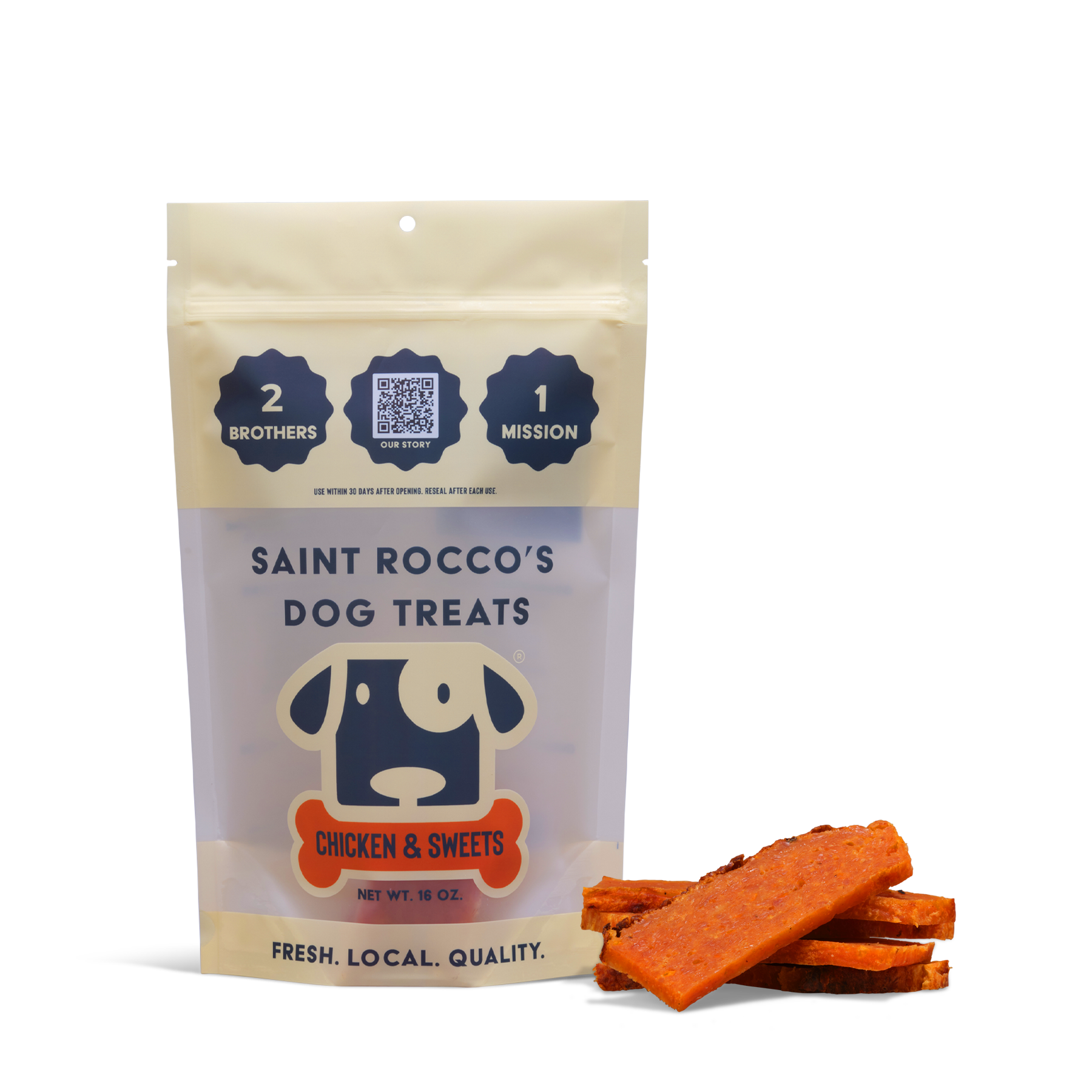 All Saint Rocco's Treats have a 4-month shelf life when resealed after each use & kept in a room temperature, dry environment.