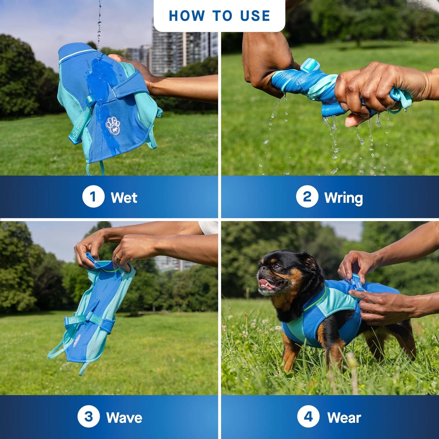 The Max Chill Cooling Vest is designed with CoolCore fabric technology to keep your pup cool even on the hottest days. Just add water to the fabric, wring and wave the vest to initiate the superior cooling effect! - Made with CoolCore fabric technology - Just add water and wave fabric to initiate evaporative cooling effect - Easy pull-on design with buckle closures - No chemical coolants - Slit for leash attachment