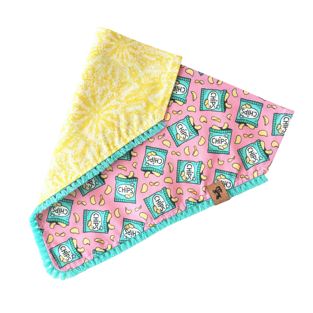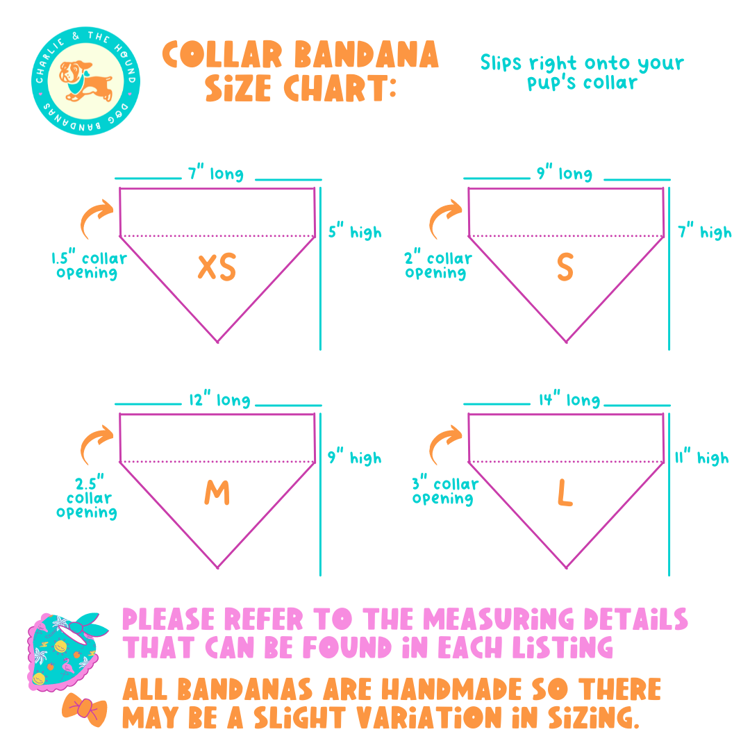 Collar bandanas slip right onto your pups existing collar, so no more fear of it falling off while playing! The best part is they’re reversible giving you two bandanas in one. Each bandana is handmade with 100% cotton and top stitched around the edges for added durability. Decorative trim is added to the hem to make your bandana shine even more. All bandanas are handmade and there may be a variation in sizing and pattern placement. Colors may vary due to different electronic devices. XS - 1.25" collar opening (7" L x 5" H) S - 1.5" collar opening (9" L × 7" H) M - 2" collar opening (12" L × 9" H) L - 2.5" collar opening (14" L × 11" H)