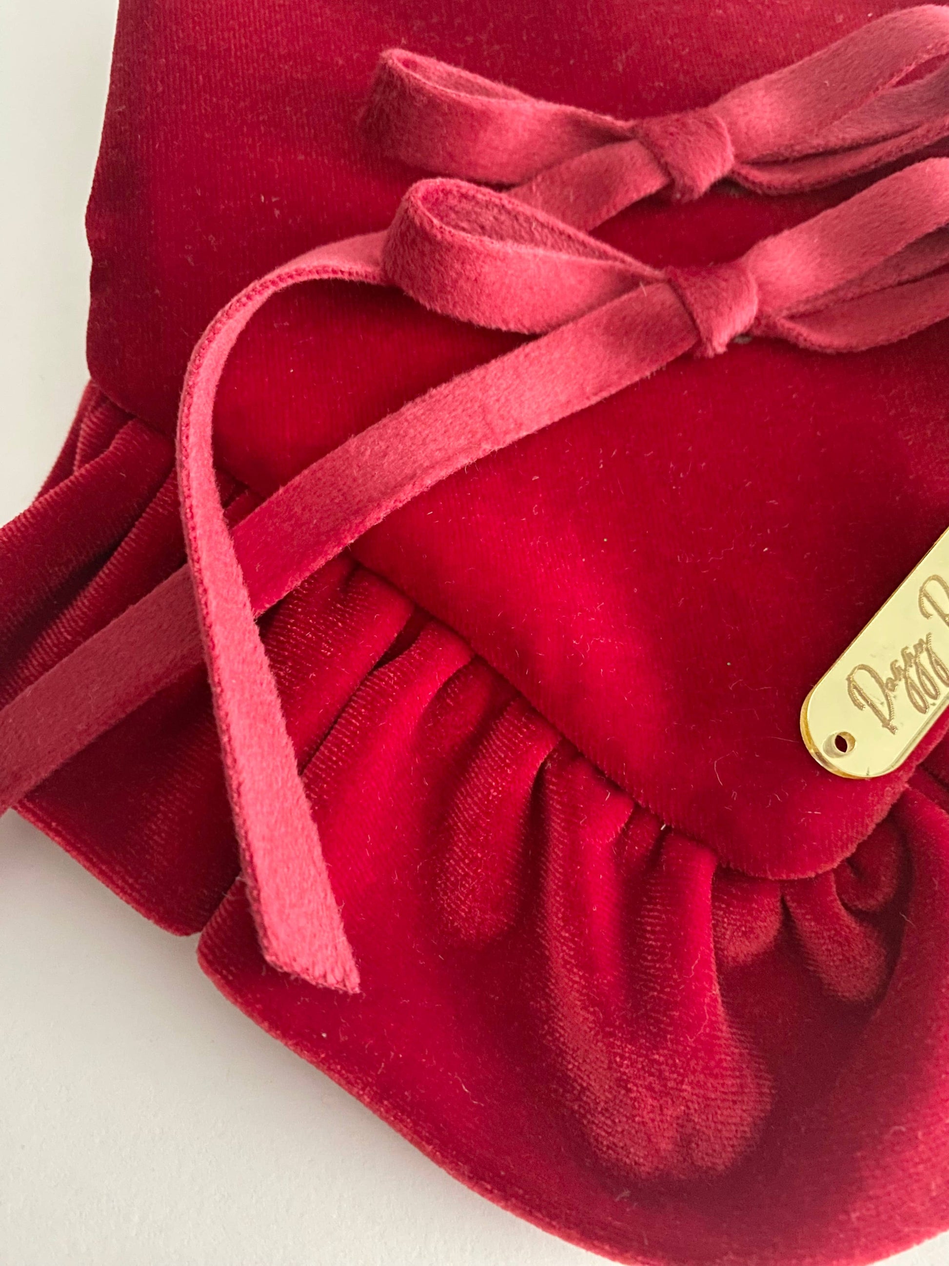 This bandana is made with a red velvet fabric and velvet ribbon bows on the front. Comes with or without ruffle. Ruffle adds an extra 1 - 1 1/2” along hem. White flannel on the backside. Each bandana comes with a gold acrylic logo tag hand sewn on. Comes with a woven tie around the neck with gold metal clasps on each end. Sizing: Sizing outlined in photo as well. Sizing of bandana circumference in inches: XS up to 11” neck, approx. under 15lbs S up to 16” neck, approx. 20-45lbs M up to 22” neck, approx. 50-75lbs L up to 26” neck, approx. 80+lbs If dog is in between sizes or extra fluffy, size up. Care: Spot clean only. Lay flat to dry. Iron low heat. Warning: Your pet should never be left unattended wearing a bandana or accessory.