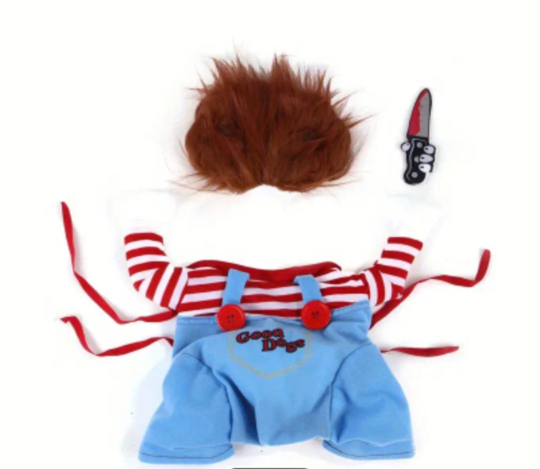 Chuck dog costume Get ready to take your pup from "ruff" to "roar" in this Chucky Dog Costume! It's a "killer" look that'll have your furry friend standing out from the pack. Perfect for Halloween, "pupparazzis" (pups + paparazzi), or just "pawliday" (paw + holiday) parties, this costume will have your dog looking "devilishly" cute and feeling like a "dog-gone" superstar. With this costume, your pet will have everyone barking with laughter and howling with delight!