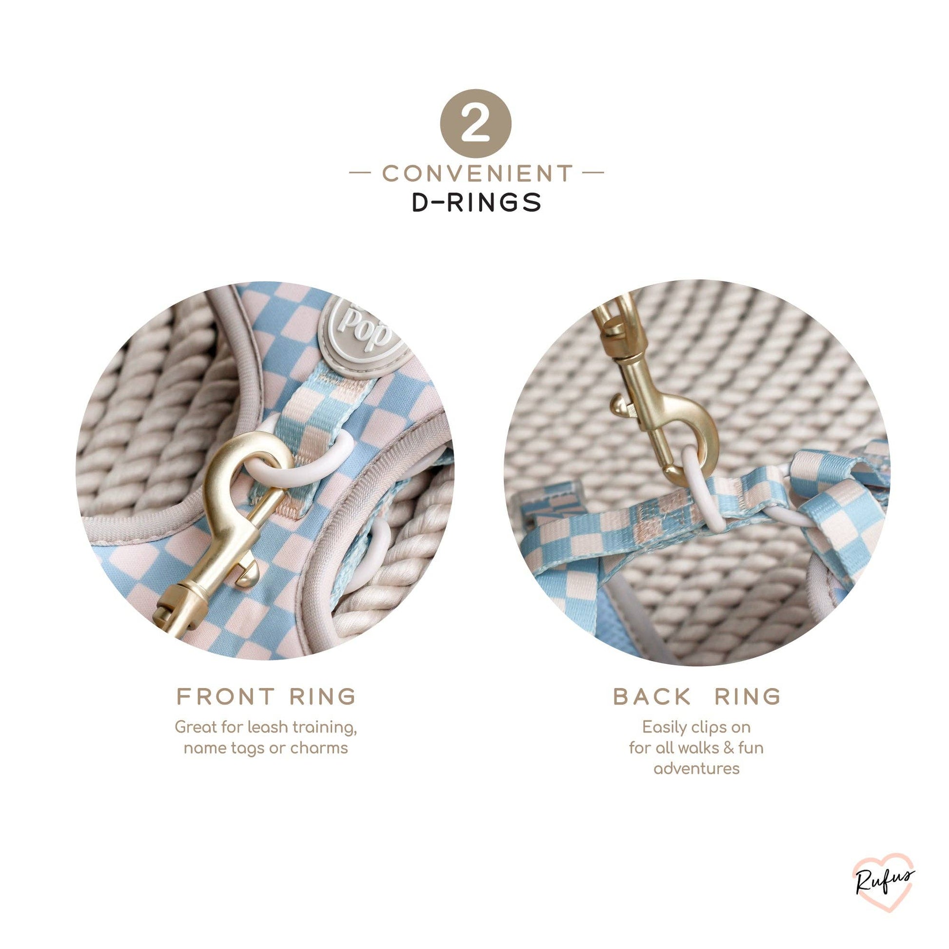 Get ready for a tail-wagging good time with our BROOKLYN Comfort Dog Harness in Slate Blue! The custom color D-ring adds a pop of personality to the stylish BLUE CHECKERBOARD PRINT. Walks will be a breeze with this comfortable and trendy harness. (Seriously, your pup will be the talk of the dog park!)