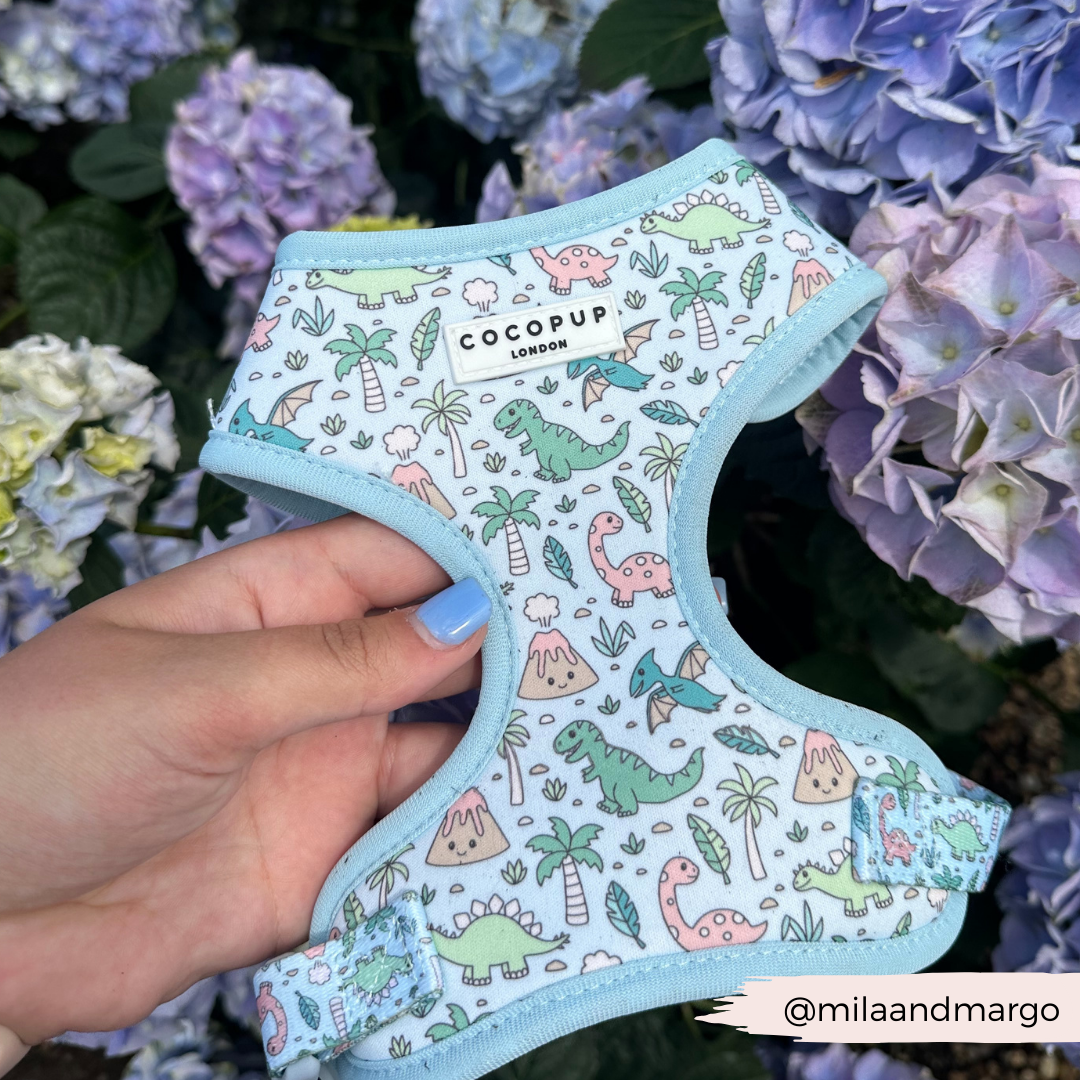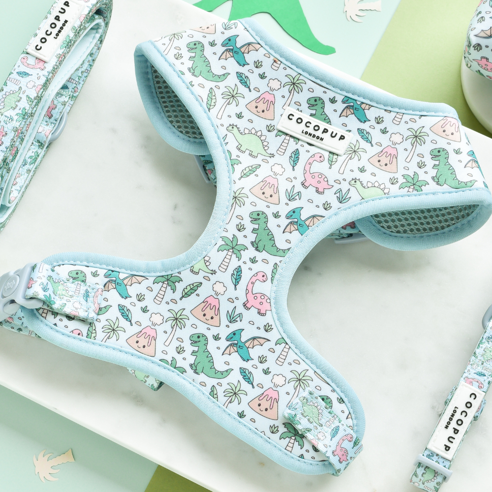 Walk your dog in prehistoric style with our Dinopaws Adjustable Neck Harness! Perfect for dinosaur-loving dog owners, this harness adds a dose of cuteness to every walk. With easy adjustability and a playful design, it's a must-have for any dog owner. Our Adjustable Neck harnesses provide a comfy and stylish alternative to collars. Slide over your pup's head, adjust at the neck and chest, fasten at the side and you'll be "walkies" ready! * Black D ring for lead attachment * Neoprene Material - quick drying! * Lightweight and comfortable * Fully adjustable neck and chest strap