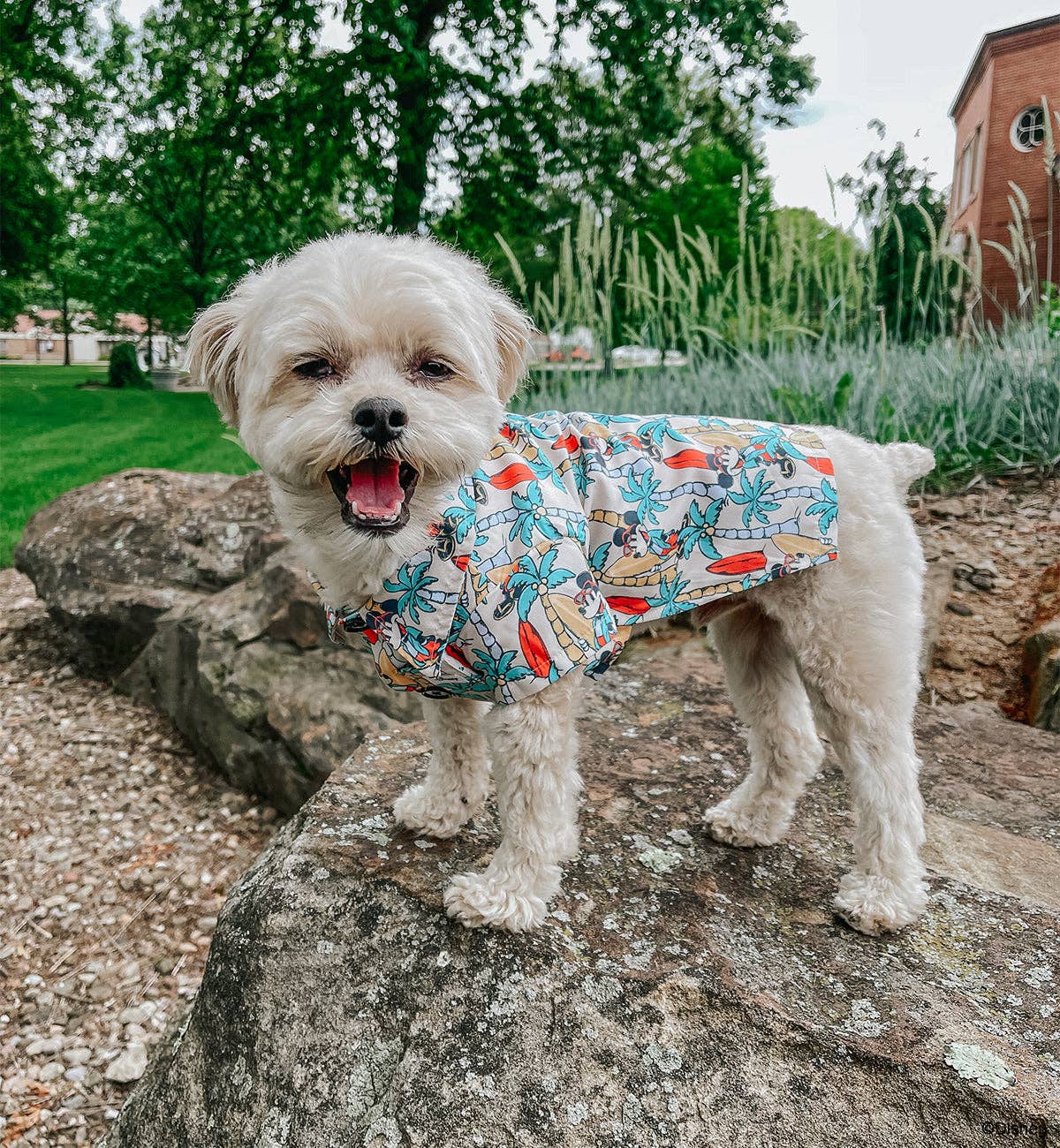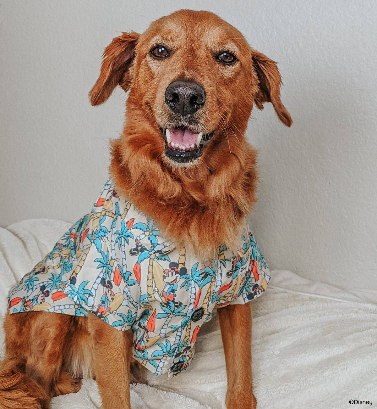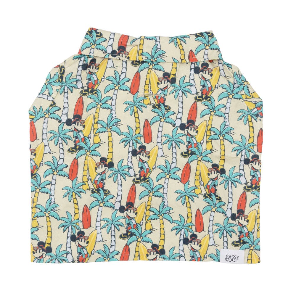 Your pup will be dreamin' of summer in this new button-up dog shirt featuring Mickey Mouse and Friends! Surf's up! * 3 buttons in the front * Small pocket in the front * 100% polyester * Hole in the back for D-Ring to come through Sizing & Care Instructions * Spot clean with soap and water. Hang to dry.