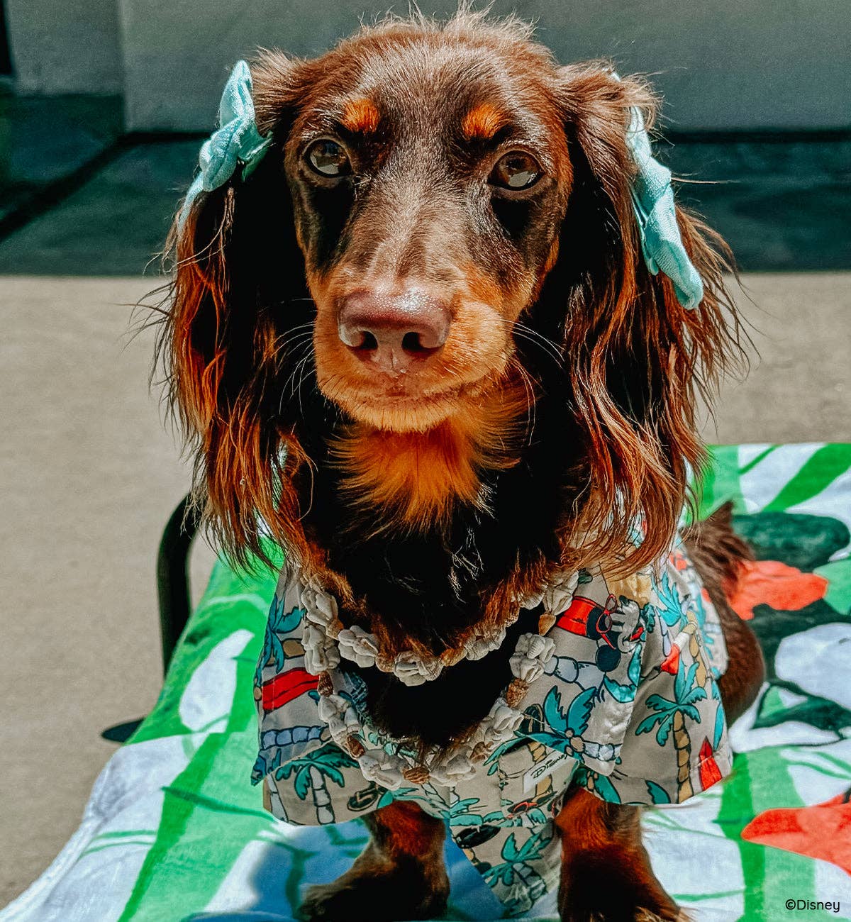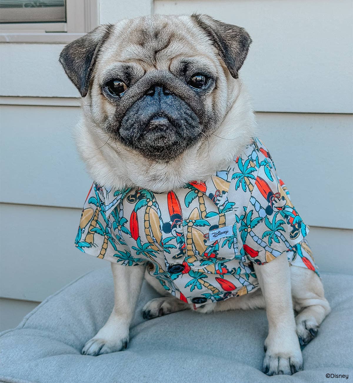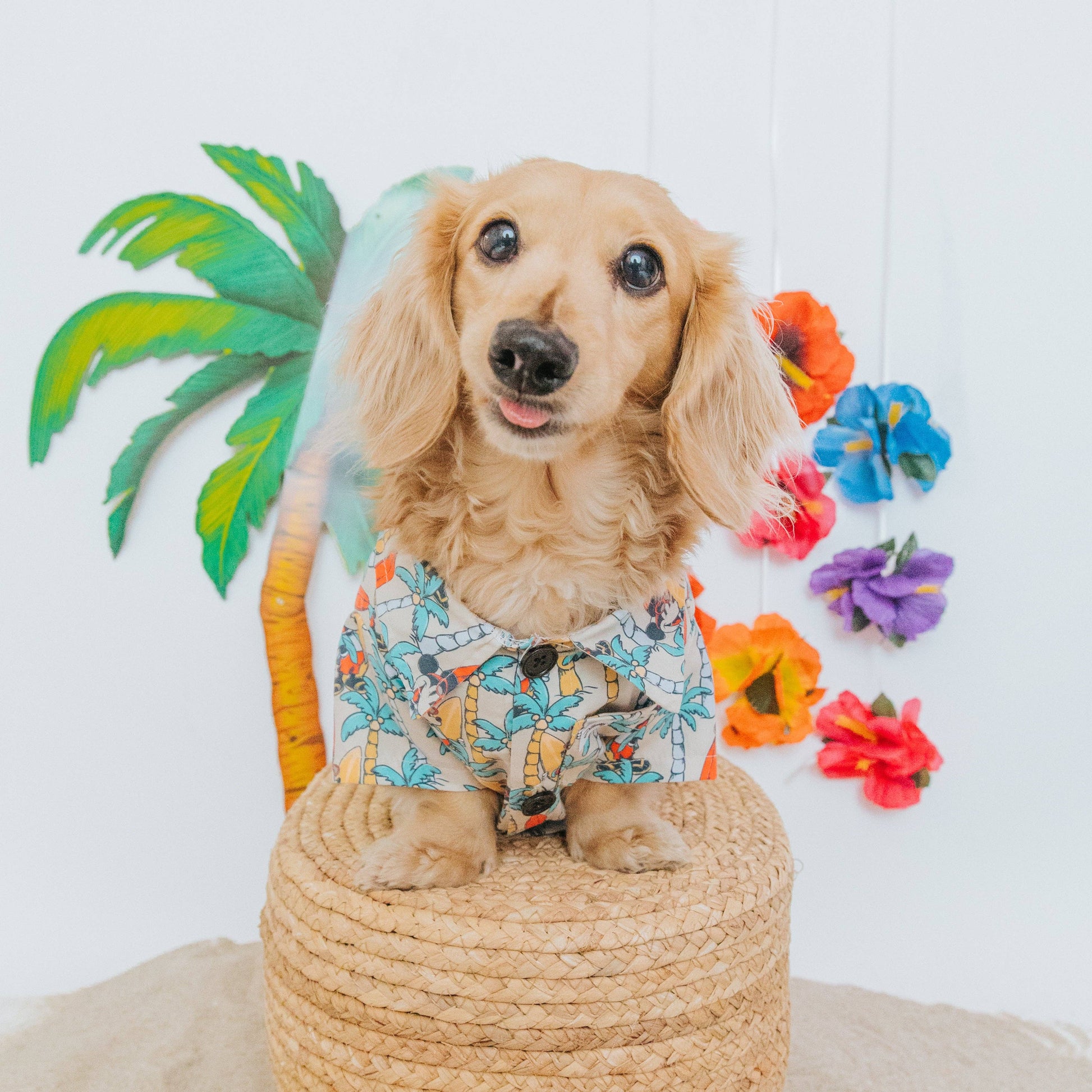 Your pup will be dreamin' of summer in this new button-up dog shirt featuring Mickey Mouse and Friends! Surf's up! * 3 buttons in the front * Small pocket in the front * 100% polyester * Hole in the back for D-Ring to come through Sizing & Care Instructions * Spot clean with soap and water. Hang to dry.