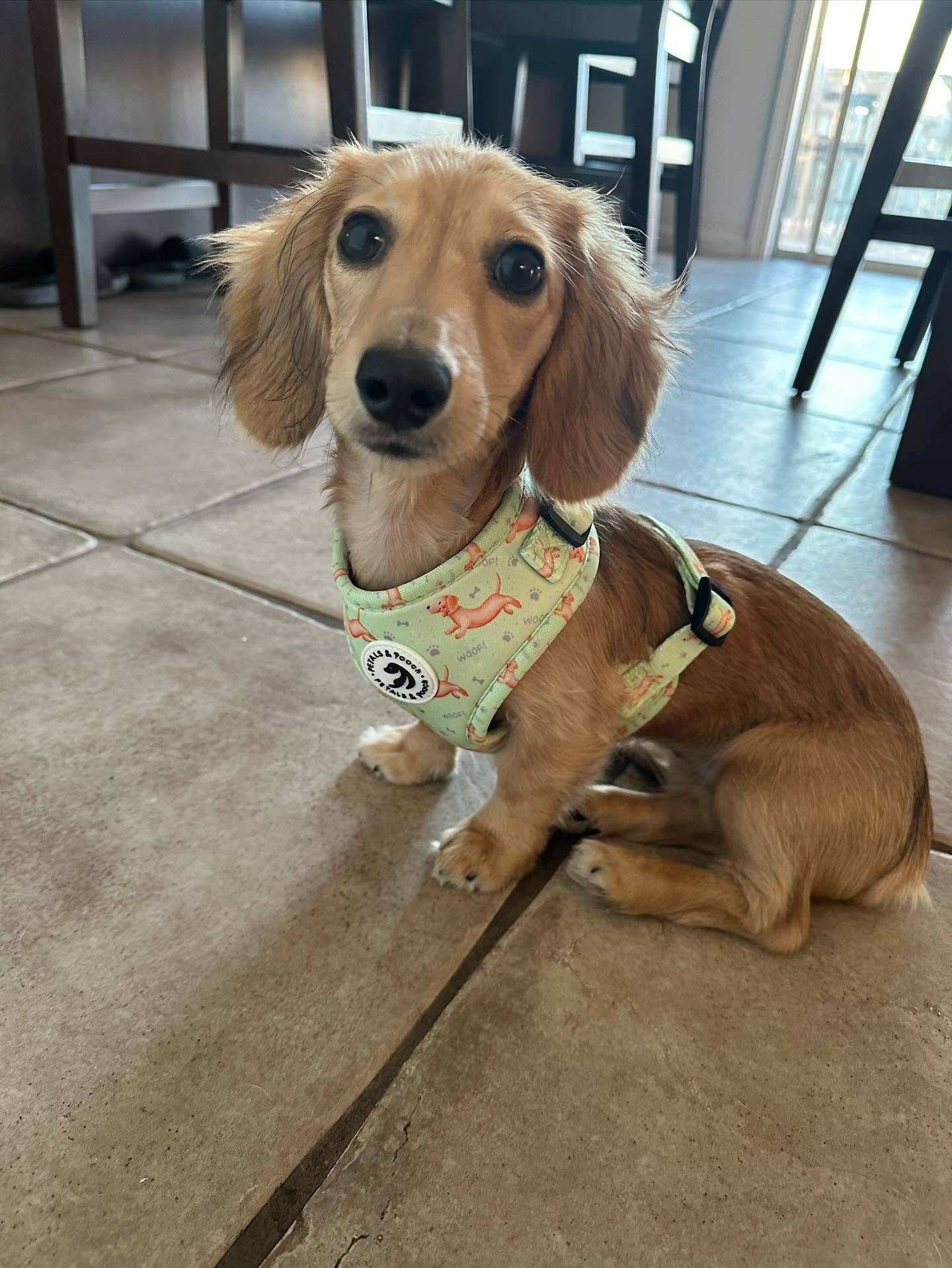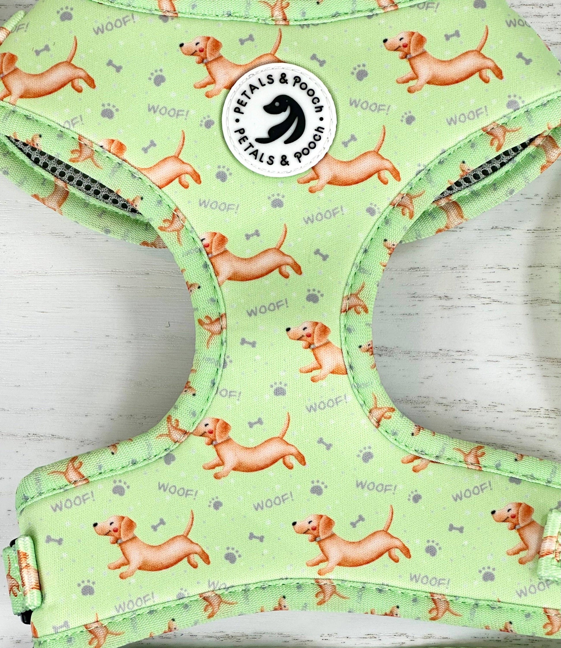 This pale green adjustable harness features cute Doxie's On the Go & ready for fun!