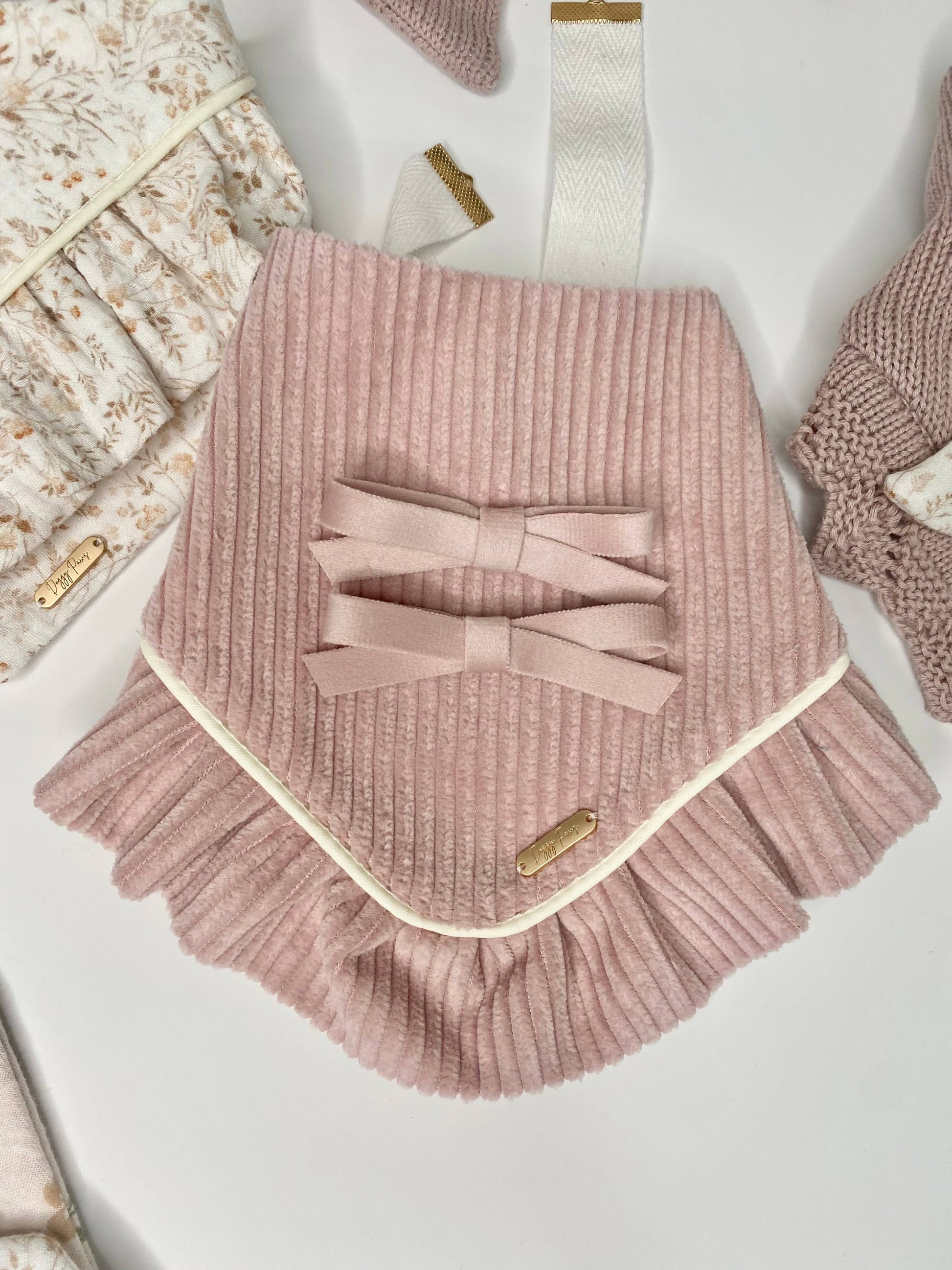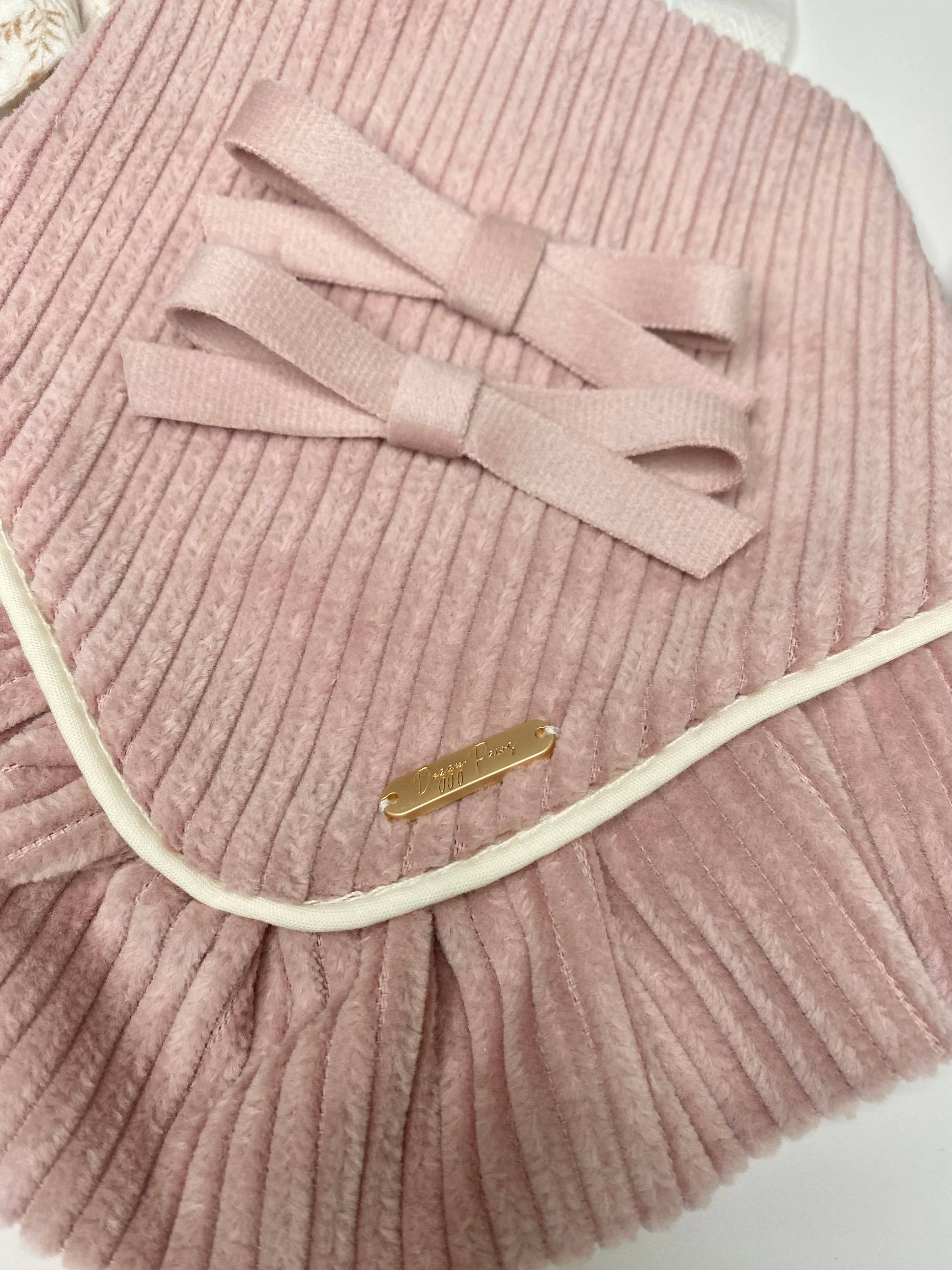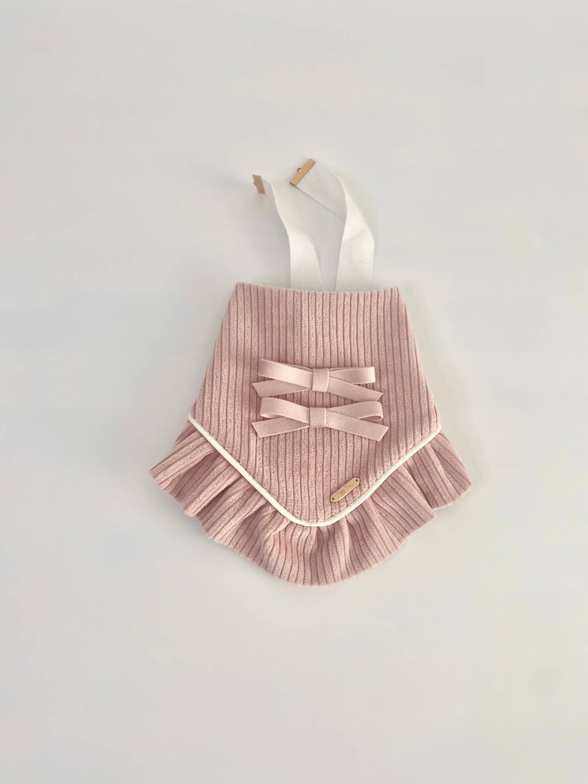 This bandana is made with a mauve purple corduroy fabric with velvet bow and off white piping detail along ruffle hem. Each bandana comes with a matte gold logo tag hand sewn on. Comes with a woven tie around the neck with gold metal clasps on each end. Handmade in Seattle, WA Sizing: Sizing chart in images. Care: Spot clean only. Lay flat to dry. Iron low heat. Warning: Your pet should never be left unattended wearing a bandana or accessory.