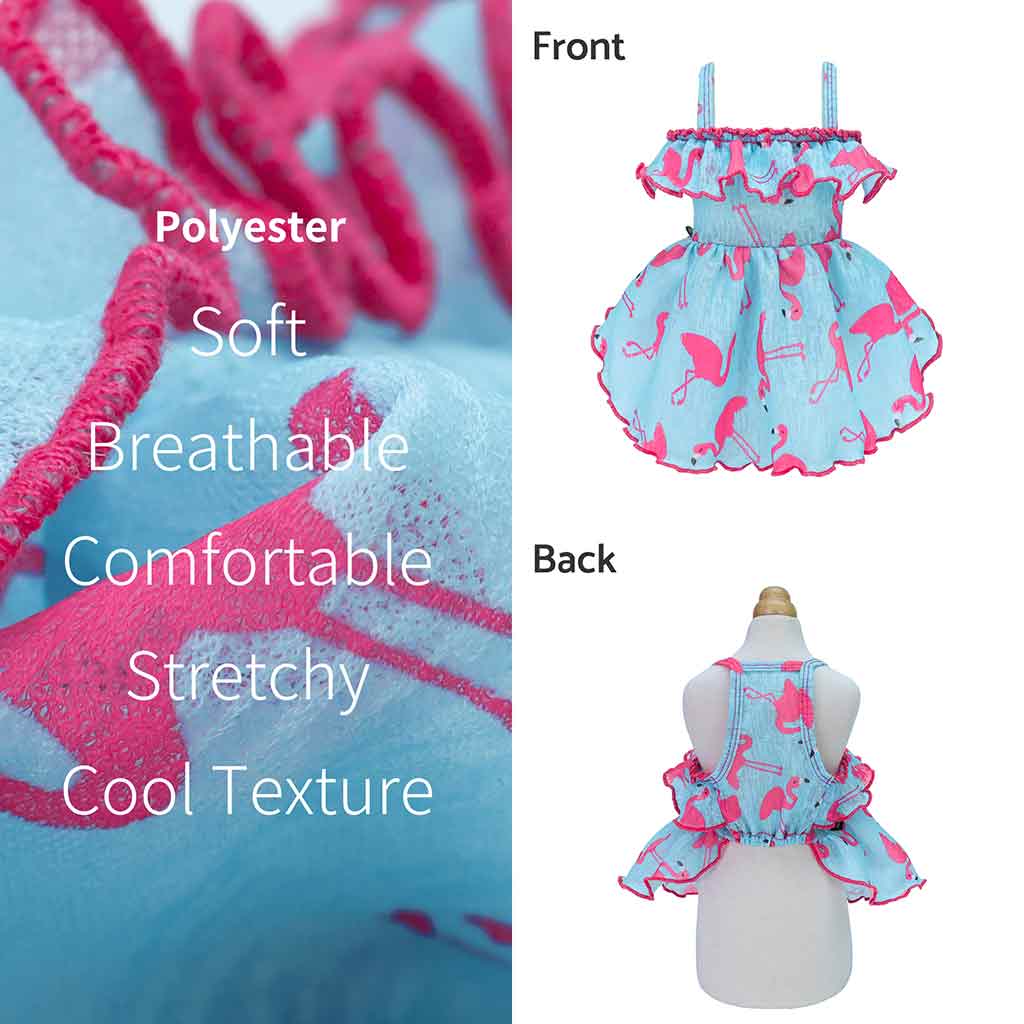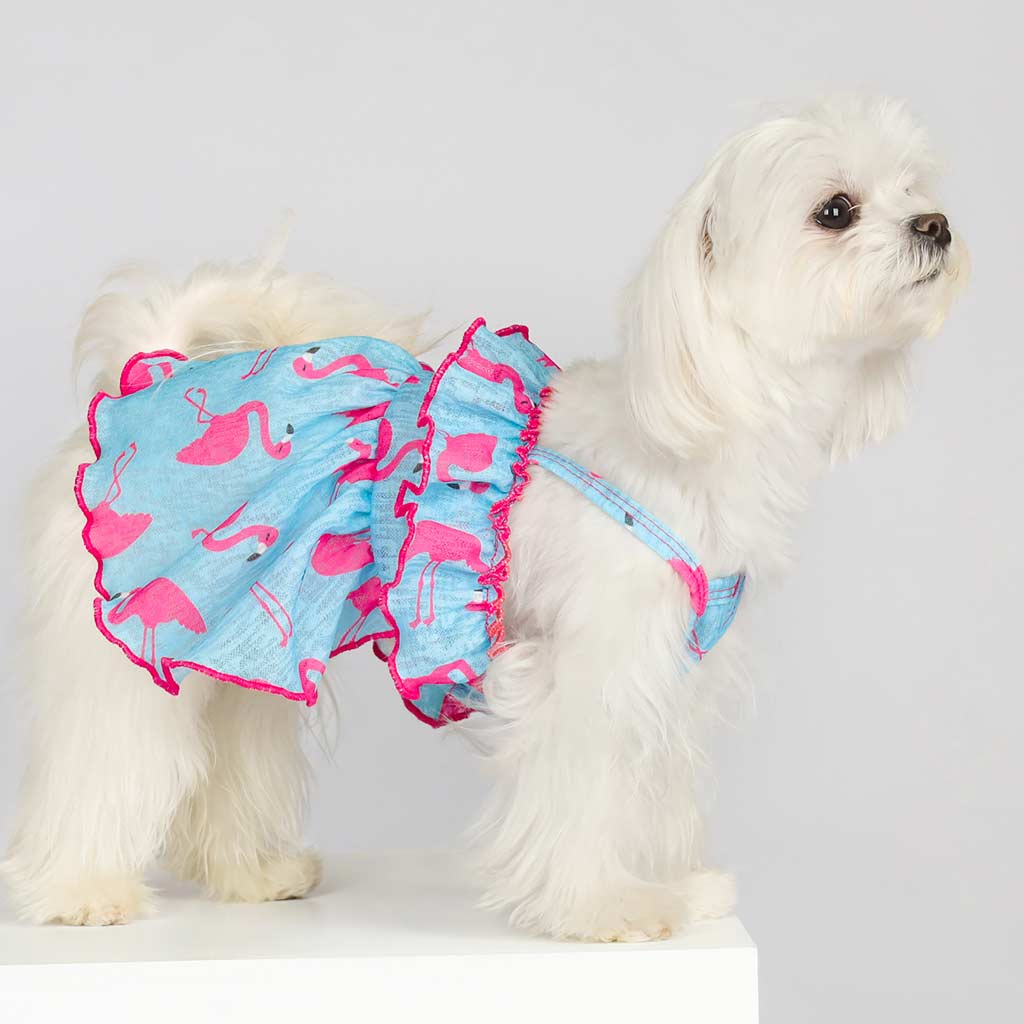 Infuse your furry friend's wardrobe with the playful charm of our flamingo themed small dog dresses. This eye catching piece is a must have for any fashion forward pup, blending a fun print with a comfortable fit. It's not just a dog dress, it's a statement of joy and style for your little companion.