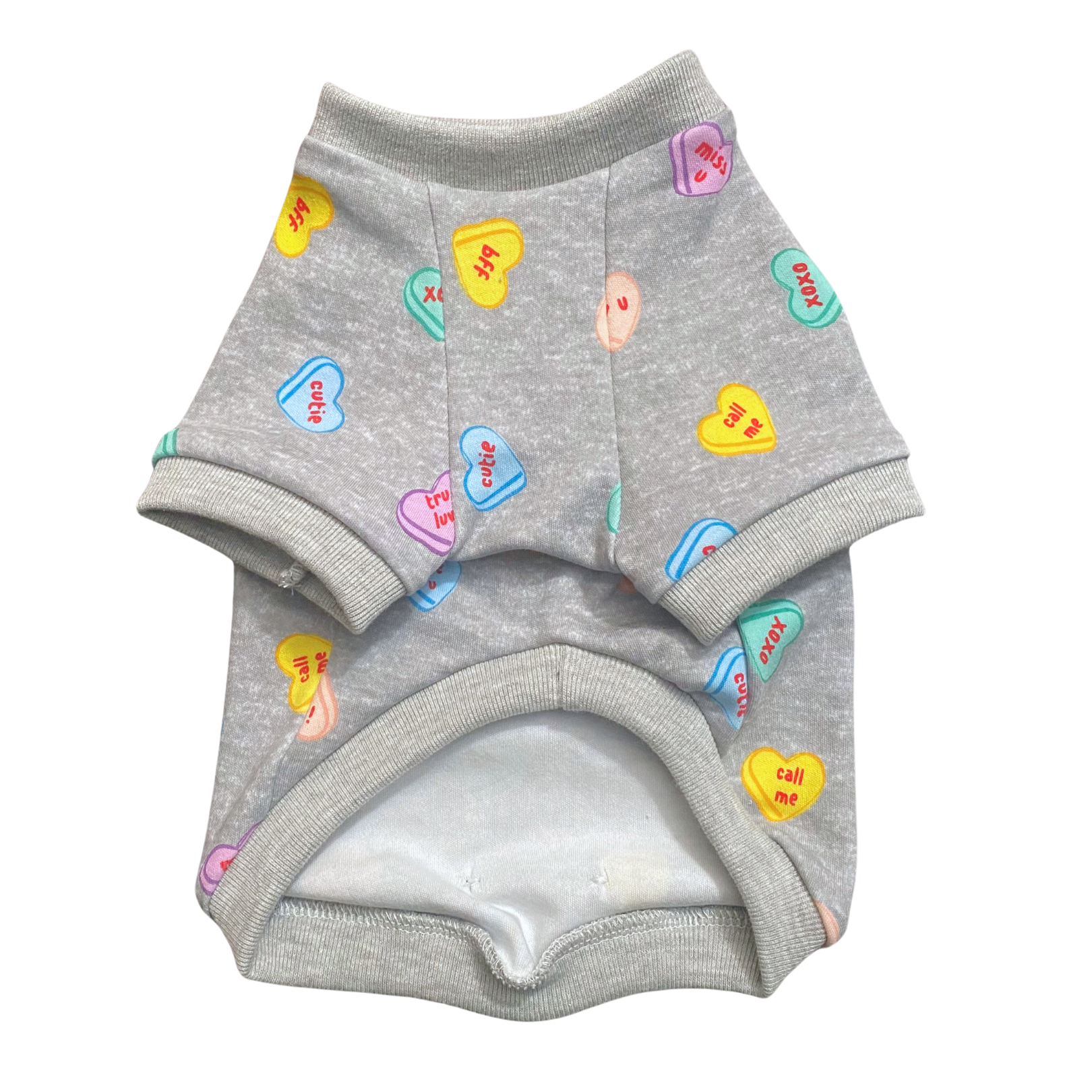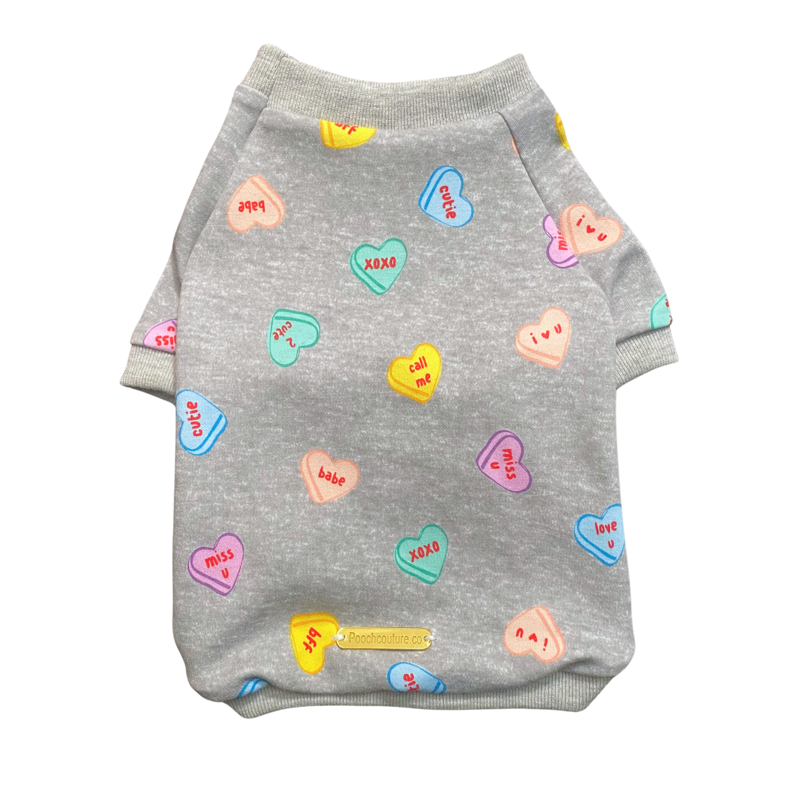 Grey Candy Hearts Dog Shirt stretchy interlock knit raglan shirt with pastel candy hearts, elastic rib knit neckband, cuffs and waistband. Size chart in images