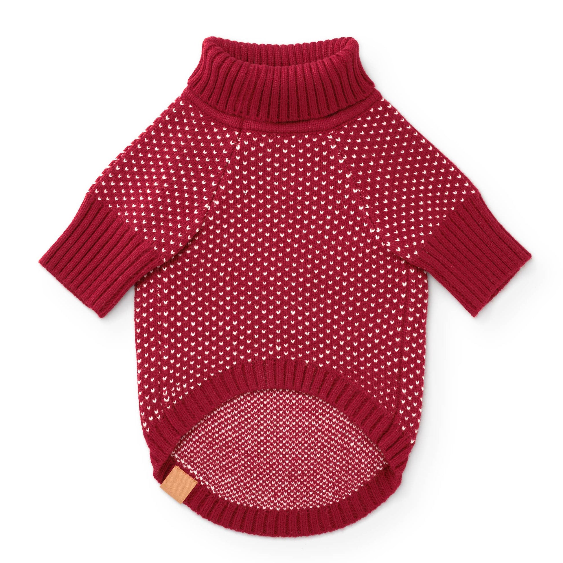 Soft and cozy, the Heart Stitch sweater features tiny white hearts on a cheery red background.