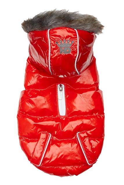 Super soft water repellent material with upscale glossy shine in 3 classic colors. Super soft brown faux fur interior is ultra luxurious and warm. HD crest logo embroidered on the hood and a designer "HD" zippers on the leash hole and pockets. Reflective banding stripes on the hood for added safety. Removable hood for versatility.