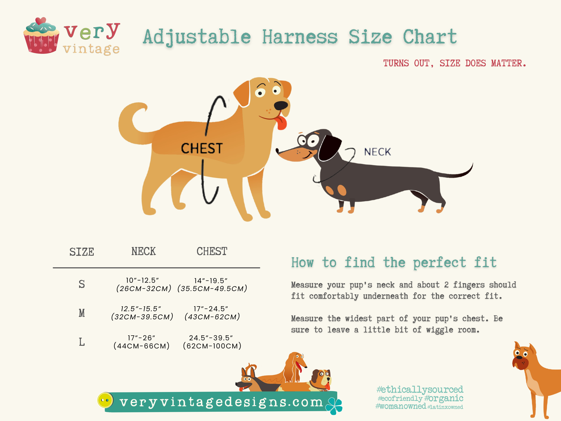 Made specifically with small dogs and kitties in mind! Soft & Comfy Padded Bodice Breathable Mesh Inner Lining All Eco-friendly and Earth-friendly materials made of recycled plastics Heavy Duty and Lightweight colored plastic buckles and adjustment sliders Solid Metal front and back d-rings for leash attachment options Reflective pieces on the front Sizing Guide: in photos