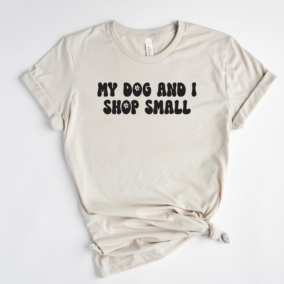 Show support for small businesses and express your love for dogs with our "My Dog and I Shop Small" t-shirt. Designed for dog enthusiasts and those who want to support local businesses, this shirt boasts a playful design and comfortable cotton fabric. Color: Dust/Natural Style: Bella Canvas FIT: Unisex