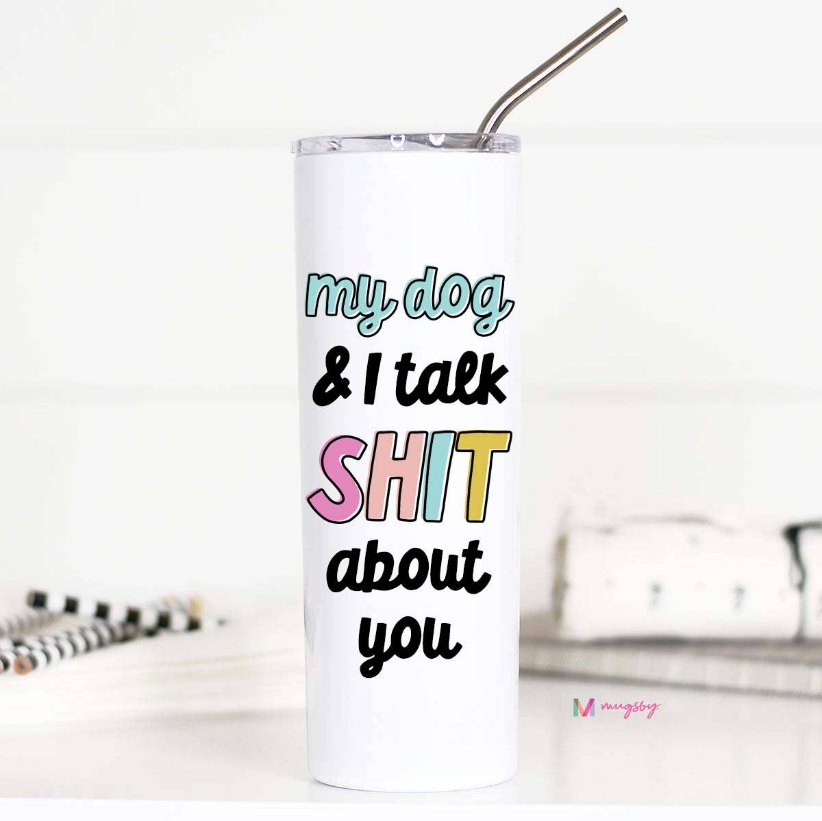 My Dog and I Talk Sh*t About You Stainless Tall Travel Cup. This tall travel cup holds 20 oz of liquid * Metal Straw and plastic lid Included. The image is printed on both sides * Not Dishwasher safe. Though the print can withstand a dishwasher on the top rack, hand wash your cup to ensure a long-lasting quality print. * Not Microwave safe. This tall travel cup is made of stainless steel. Do NOT put it in the microwave.