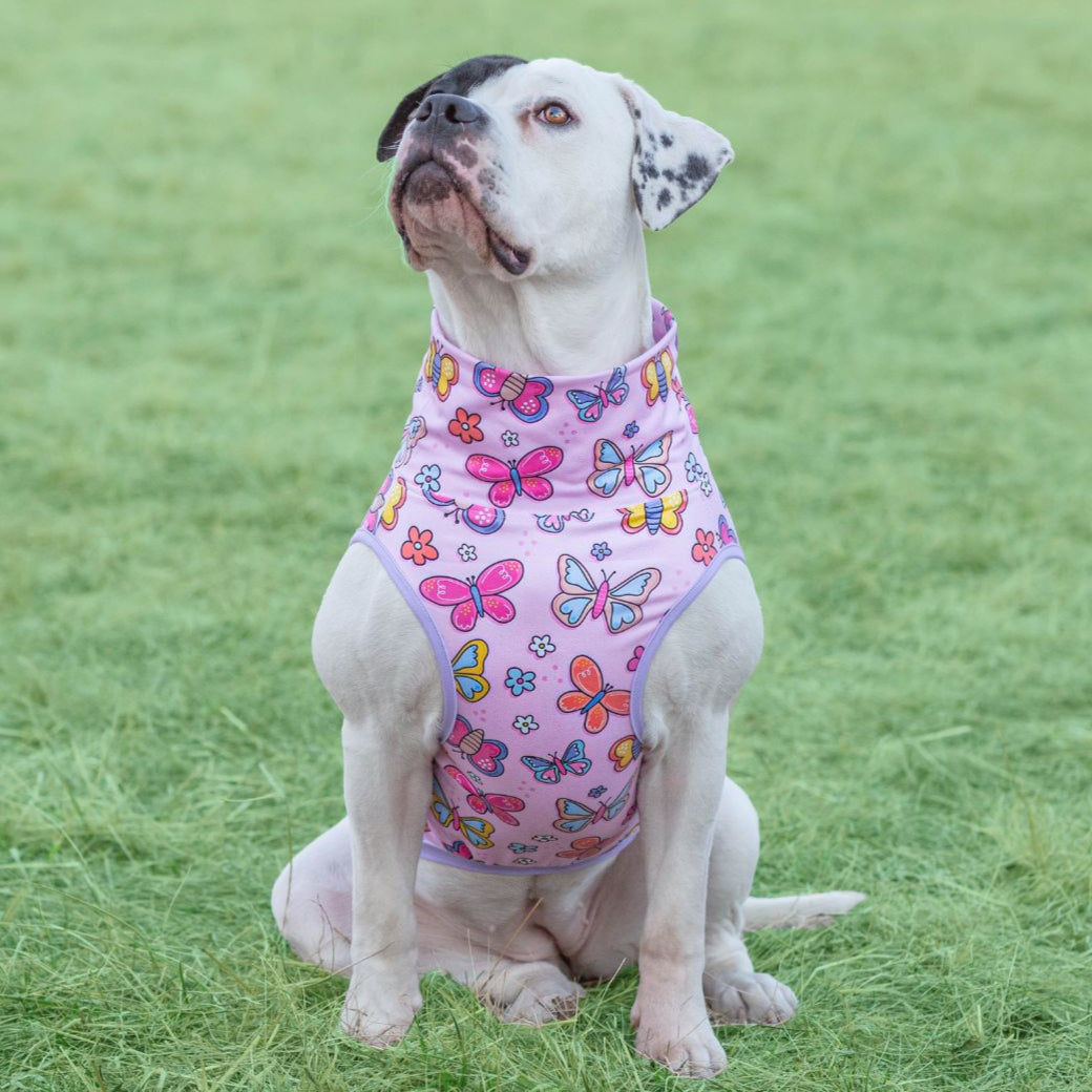 These summer tanks are sure to impress at your block parties, pool parties, and pittie parties! Keep your pittie festive this summer and show everyone his or her soft side! Details: * Stretchy, lightweight material * Neck can be worn high or folded over * High cut tummy for potty time Care Instructions: * Machine wash on cold. * Let air dry or tumble dry on low.