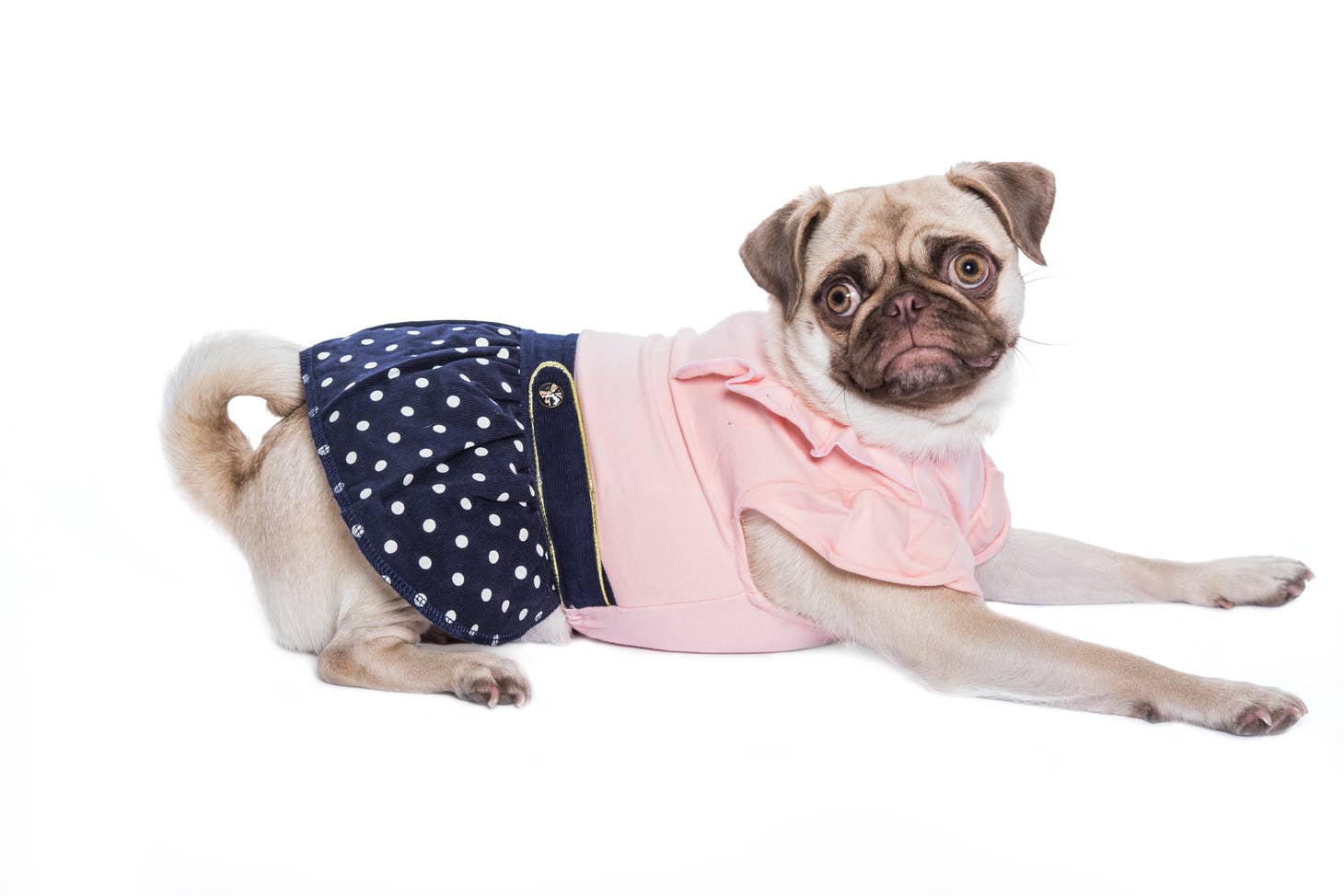 This elegant nautical dog dress will add style to any pup's wardrobe. The design features a light pink top with ruffle details, a navy blue skirt with white polka dots, and a chic belt with yellow lining and two golden buttons. Made to a high standard of quality, this cute dog dress will last for a long time.
