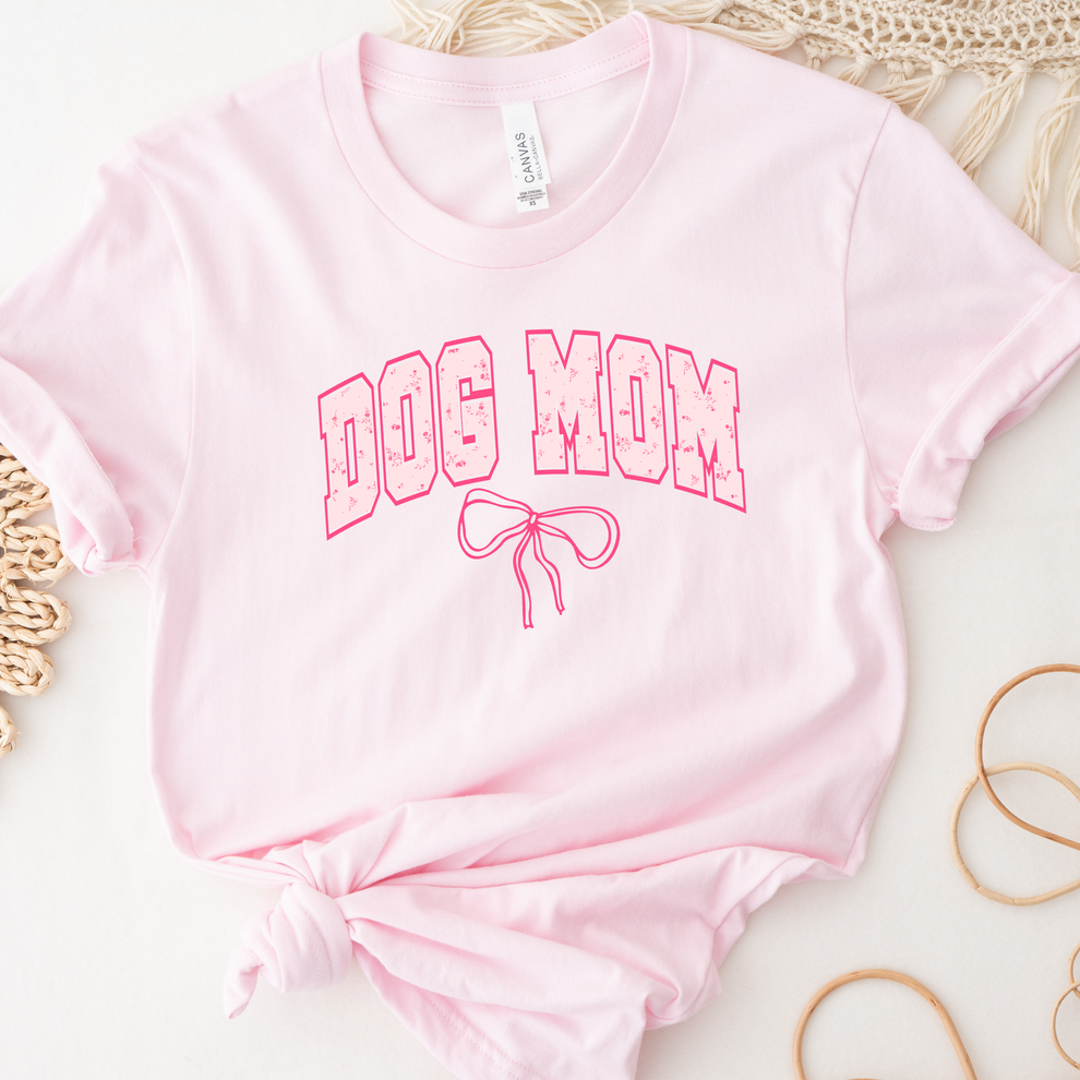 Looking for a fun and stylish way to show off your love for your furry best friend? Look no further! Our Pink Bow Dog Mom T-Shirt features a cute pink hair bow design, making it the perfect addition to any dog mom's wardrobe. So go ahead and treat yourself while showing the world your pup pride! Color: Light Pink Style: Bella Canvas FIT: Unisex