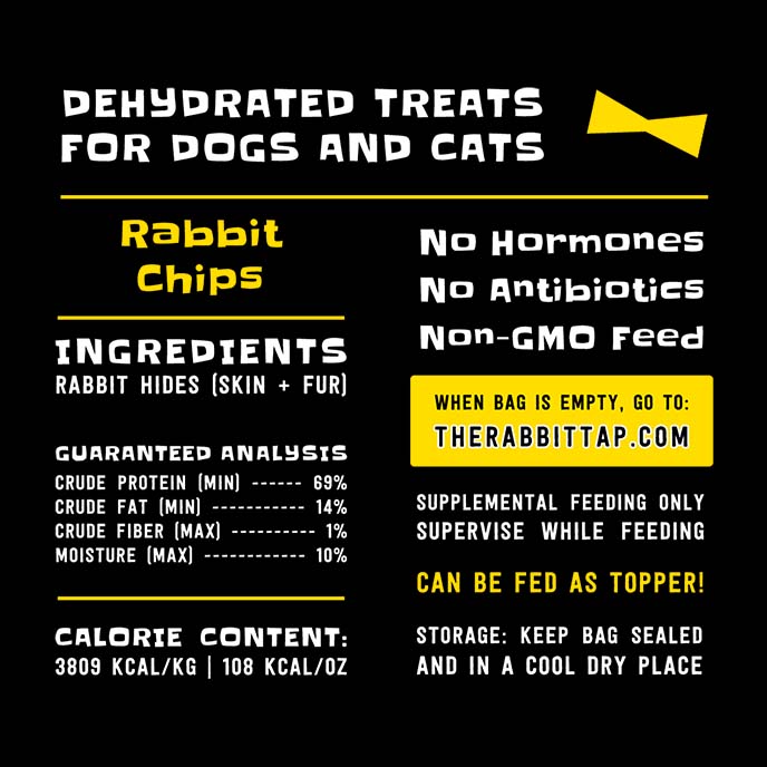 You shouldn't have to memorize a list of criteria to find trustworthy pet goodies. With The Rabbit Tap, you’ll never have to. Rabbit Chips contain just one ingredient, sustainably raised American rabbit hide. 100% natural, nothing added ever.