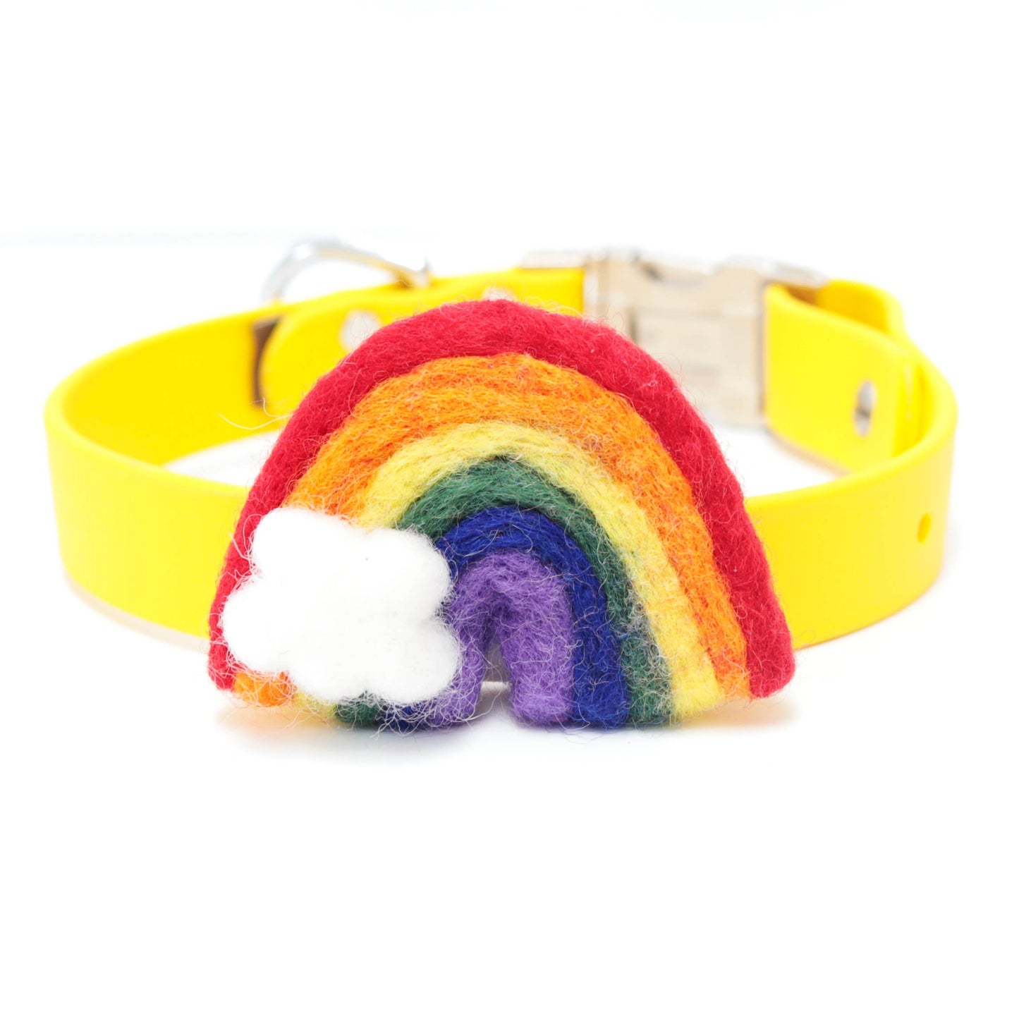 Whether your dog wants to represent pride or your pup just has a colorful personality this felt Rainbow dog collar accessory is a great addition to your pups wardrobe. Personally, I think they are great year-round. Materials Handmade from American-made wool felt Elastic ring wraps around collar to secure the flower to your dog's collar and easily remove to wash Washable (gentle cycle + air dry) Made in the USA. Collar not included. Details + Fit The rainbow measures 3.5" x 2.5" and is best suited for Medium to Large size dogs. They are pictured with a 1" wide collar.