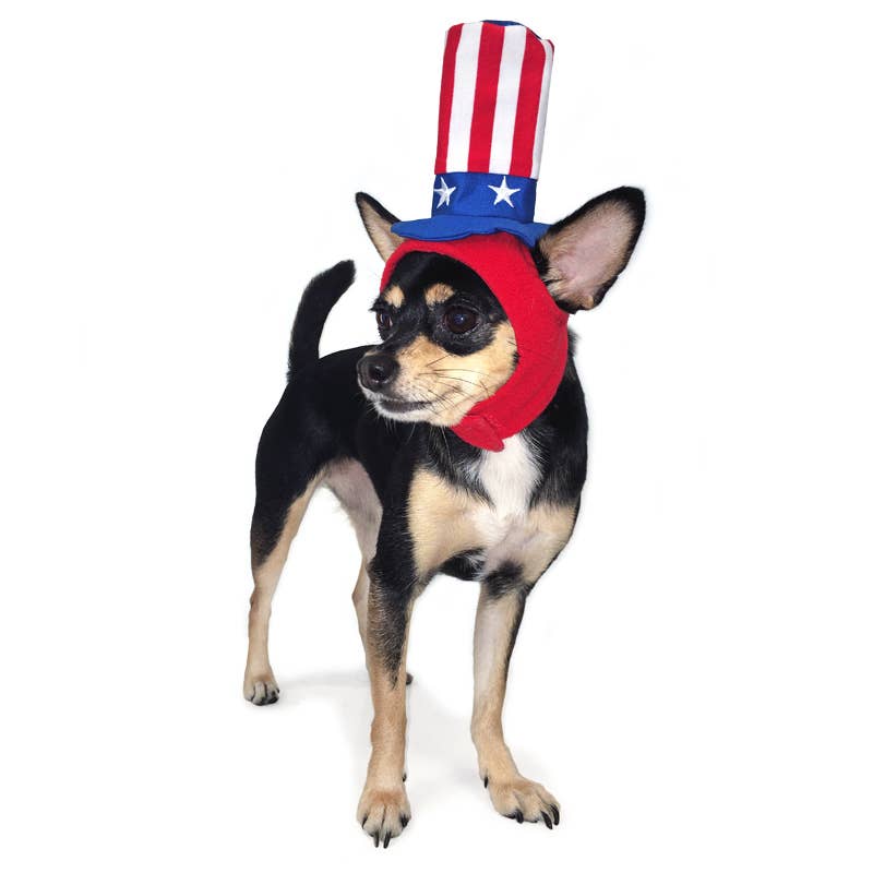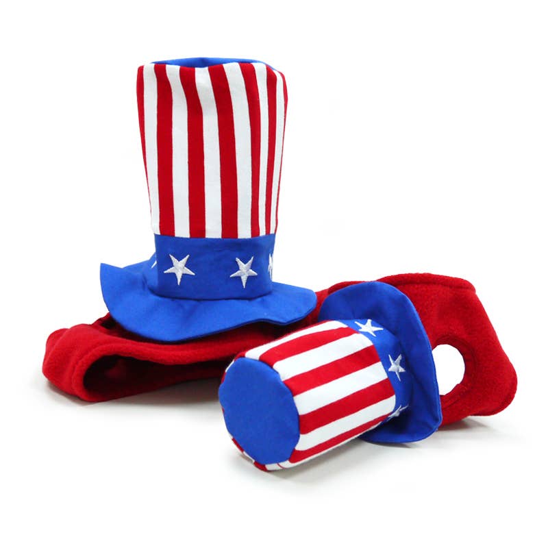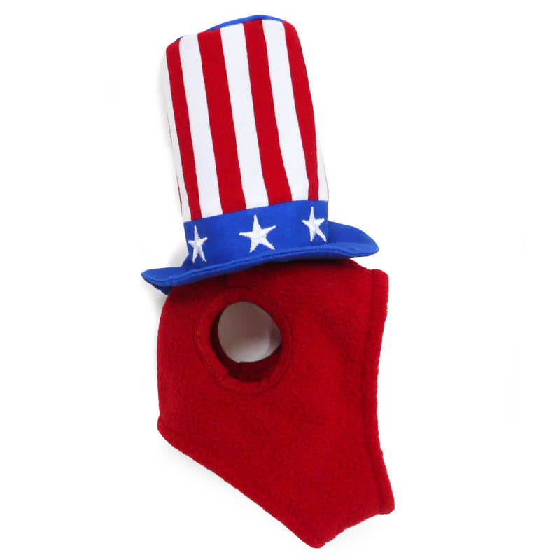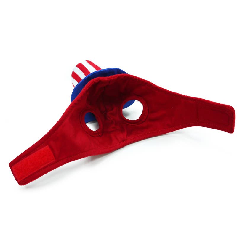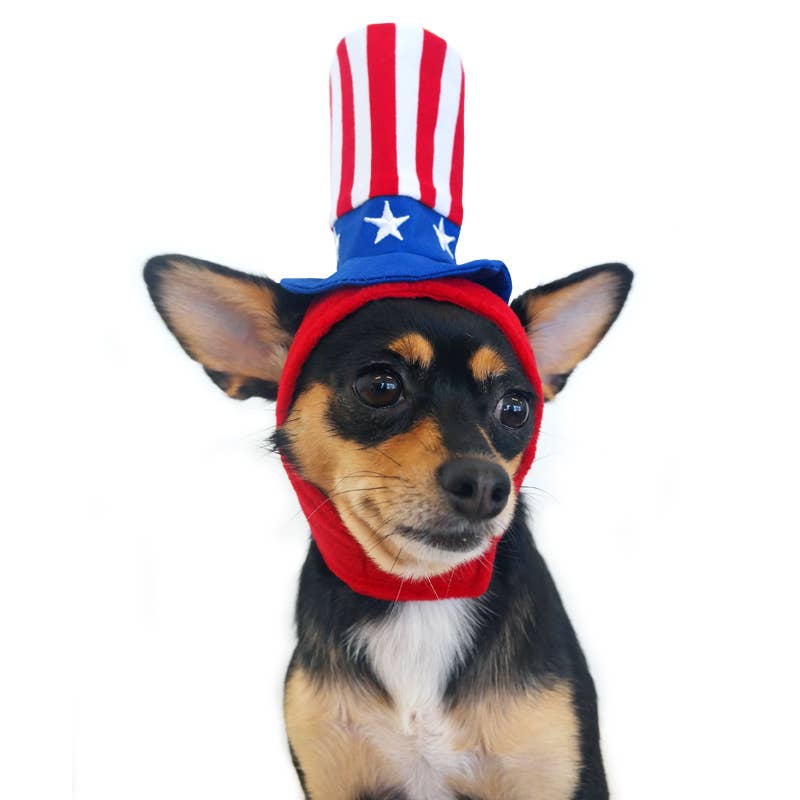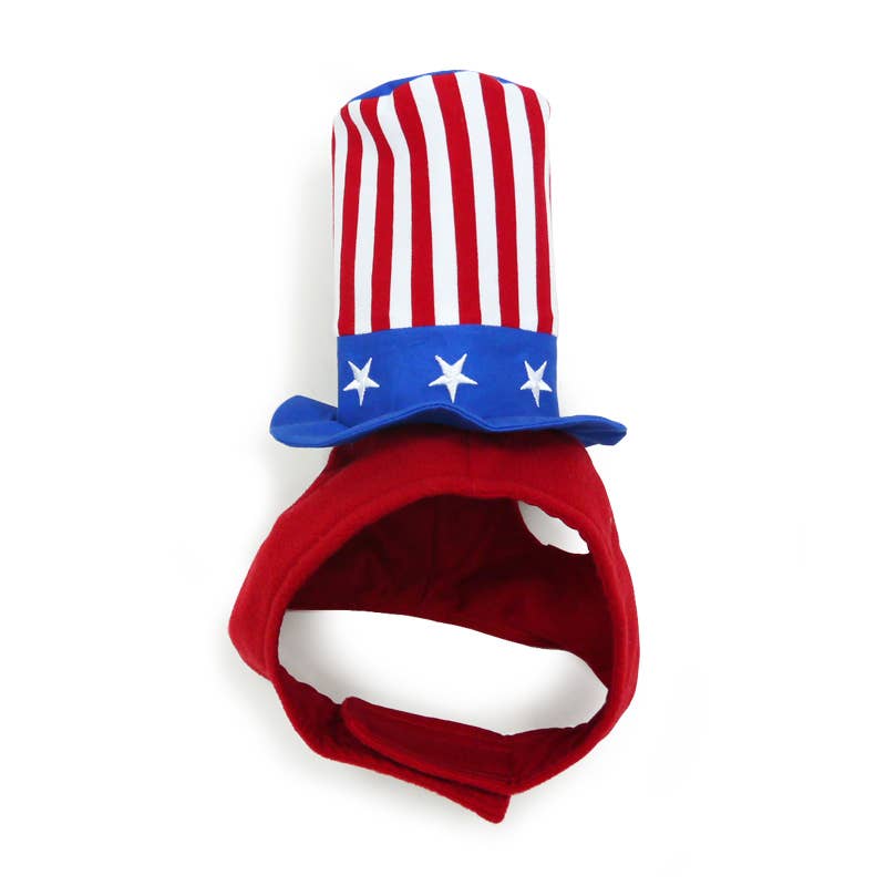Stars and stripes patriotic tall hat with ear holes. Adjustable Velcro strap designed to fit just right.